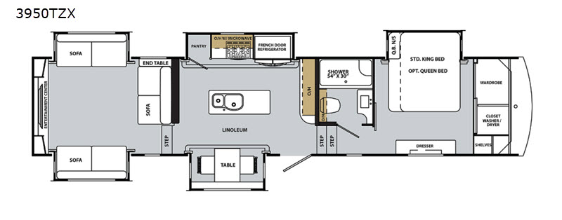 Come see just how fun and easy your next camping trip can be when you choose to camp with this Cardinal Luxury 3950TZX fifth wheel. There is plenty of space to move around thanks to the quad slide outs, plus you will find plenty of storage space with all of the overhead cabinets, pantry, and hutch. The rear living area is the perfect place to visit or watch your favorite movies on the 50" LED TV. Here you will also find three sofas and an electric fireplace. Your meals can be enjoyed around the two person free-standing table, and you can store your delicious leftovers inside the stainless steel residential refrigerator. At night you can enjoy the comforts of the front private bedroom, where you will find a king-size Denver mattress with the option to switch it out for a queen-size, a wardrobe, a dresser, and a closet that is ready for you to add the optional washer/dryer!