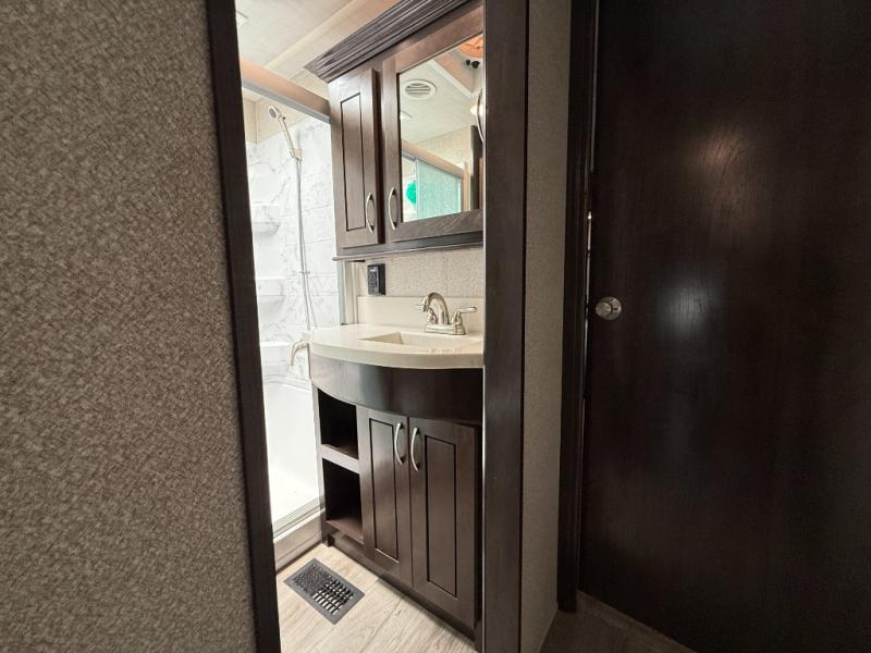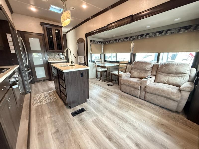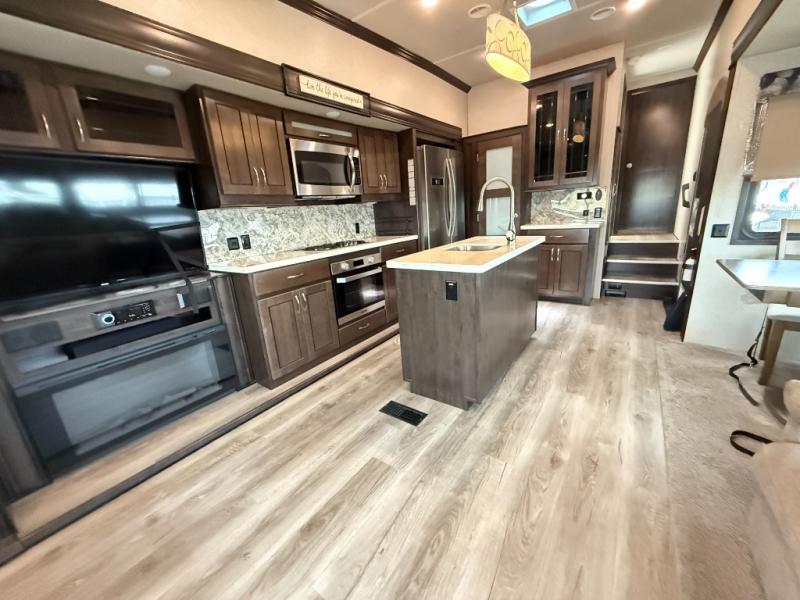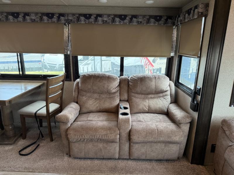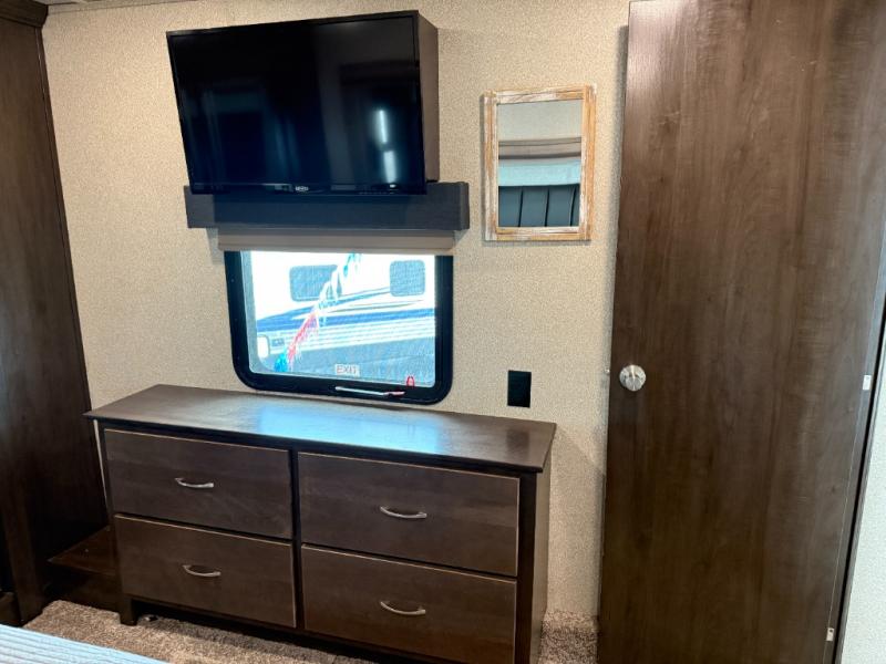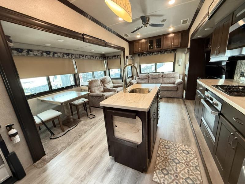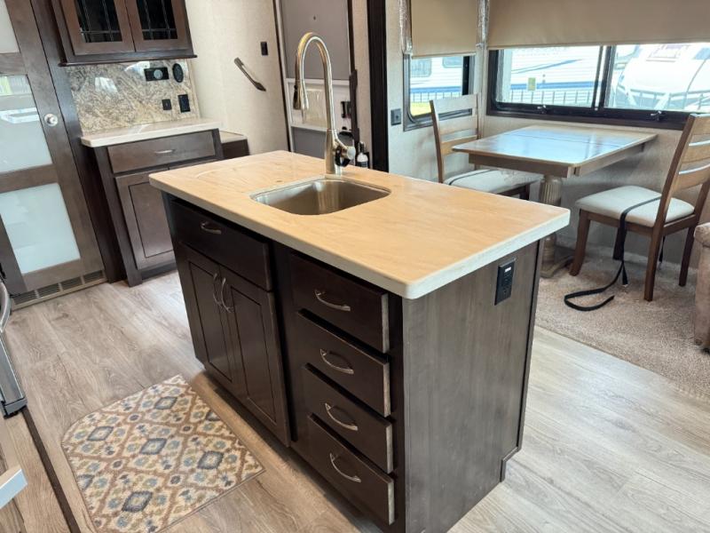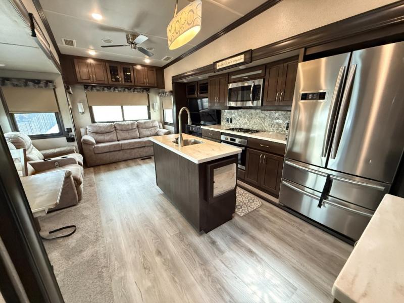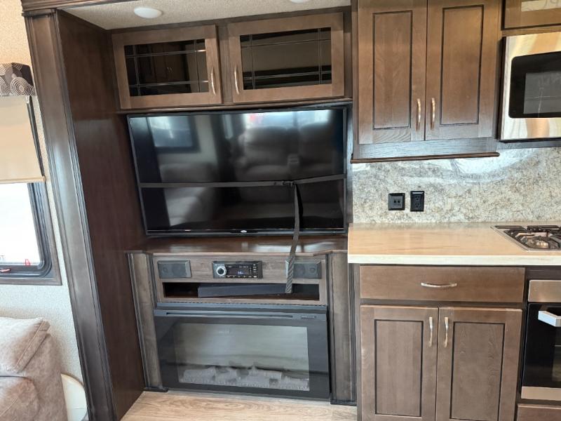 Are you ready to get away for the weekend while still enjoying the luxuries of home? Well then come check out this fifth wheel! It has a convenient kitchen island to provide more counter space and a double bowl sink with a high rise faucet to make clean up a breeze. You will also enjoy relaxing on the sofa or in the theater seating with cup holders while you watch a movie on the 50" LED TV. If it's a chilly evening, everyone will love to watch the glow of the fireplace as you reminisce about your day. Mom and dad will love the front private bedroom that features a slide out queen bed and a large wardrobe and a dresser for all their clothes. There has even been a place prepped for you to add a stackable washer and dryer if you choose!