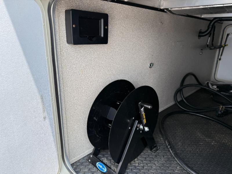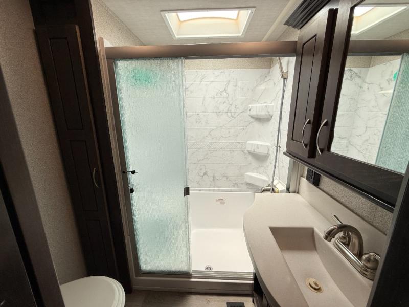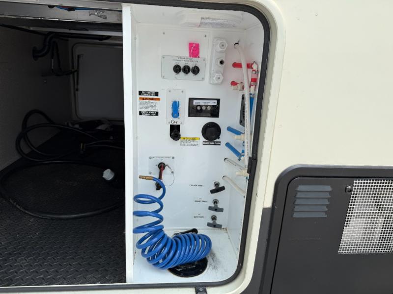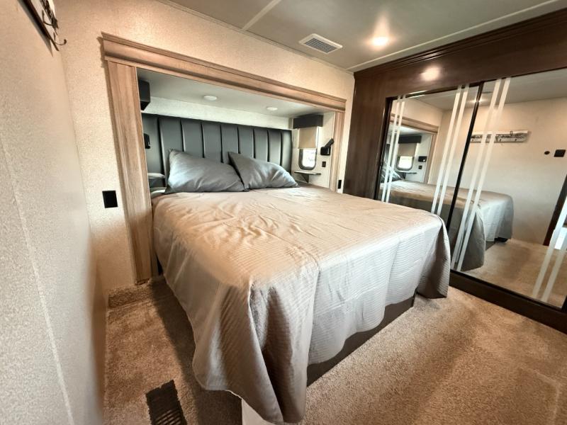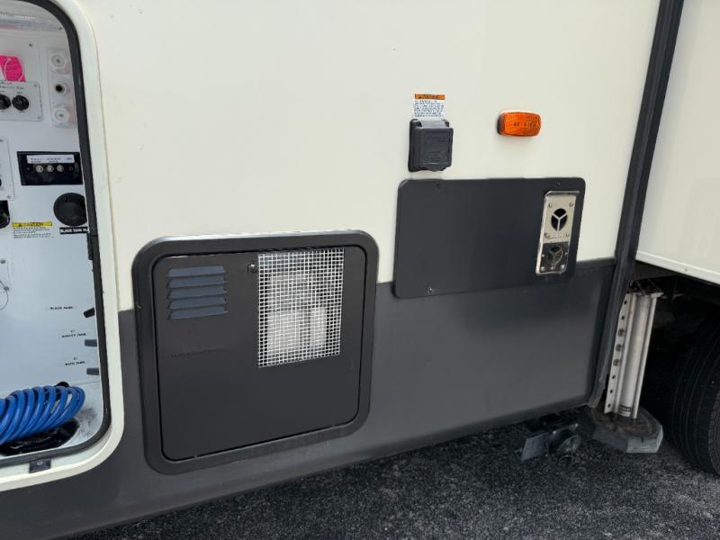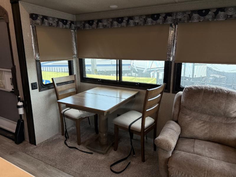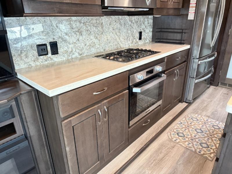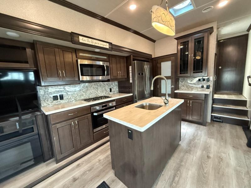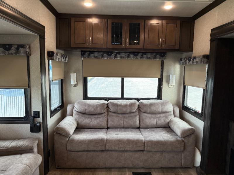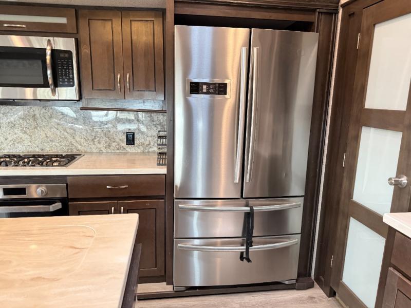 Are you ready to get away for the weekend while still enjoying the luxuries of home? Well then come check out this fifth wheel! It has a convenient kitchen island to provide more counter space and a double bowl sink with a high rise faucet to make clean up a breeze. You will also enjoy relaxing on the sofa or in the theater seating with cup holders while you watch a movie on the 50" LED TV. If it's a chilly evening, everyone will love to watch the glow of the fireplace as you reminisce about your day. Mom and dad will love the front private bedroom that features a slide out queen bed and a large wardrobe and a dresser for all their clothes. There has even been a place prepped for you to add a stackable washer and dryer if you choose!