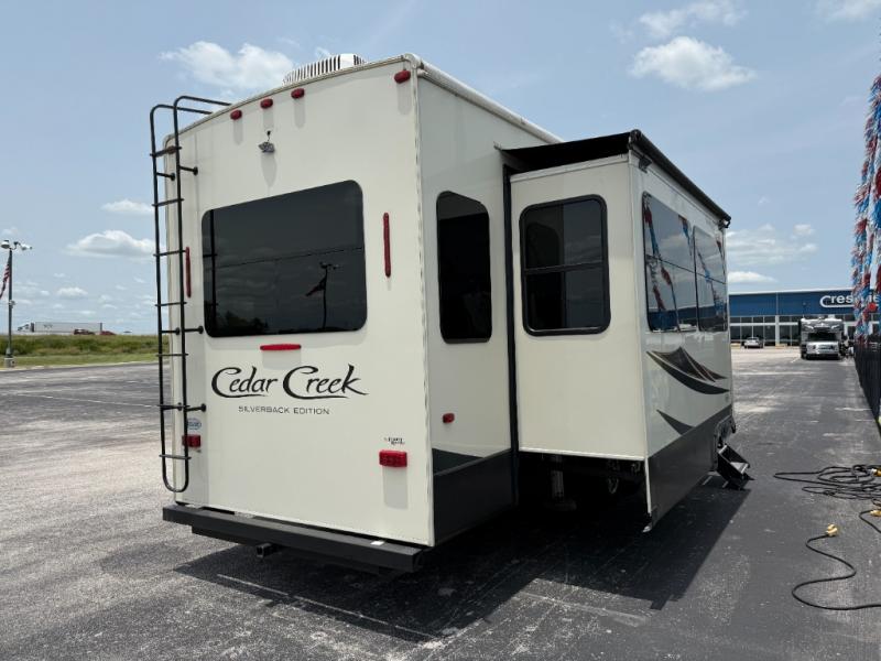 With any Forest River Cedar Creek Silverback Edition fifth wheel you will find Congoleum carefree flooring throughout and in the dining slide there is Shaw carpeting. The kitchen has everything that you would expect to find at home and more from the Furrion chef's kitchen with a gas cooktop, to the full panel backsplash, you won’t be disappointed! The 36" electric fireplace, the Jensen 12 volt CD/DVD/AM/FM/MP3/USB stereo system with a smart control app and Bluetooth, and the 50" LED TV with a swing arm in the living room are sure to be crowd pleasers! Each fifth wheel is constructed with Cedar Creek's famous all aluminum super-structure with a radius wrap metal skirt, and a Z-frame. Plus each comes with a Dexter safety and performance package which includes Dexter axles/brakes/suspension, and a Dexter E-Z flex rubber equalization system with bronze bushings and six greased zerks per side. You are sure to love camping in any one of these Forest River Cedar Creek Silverback fifth wheels so come choose your favorite one today!