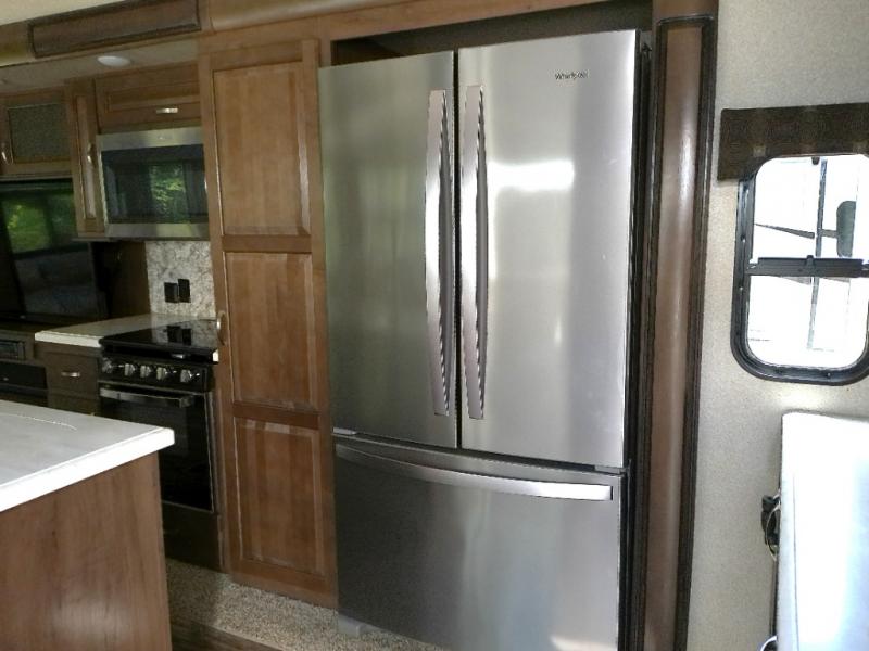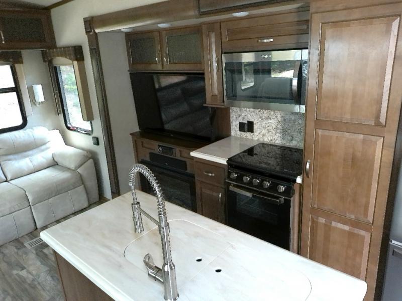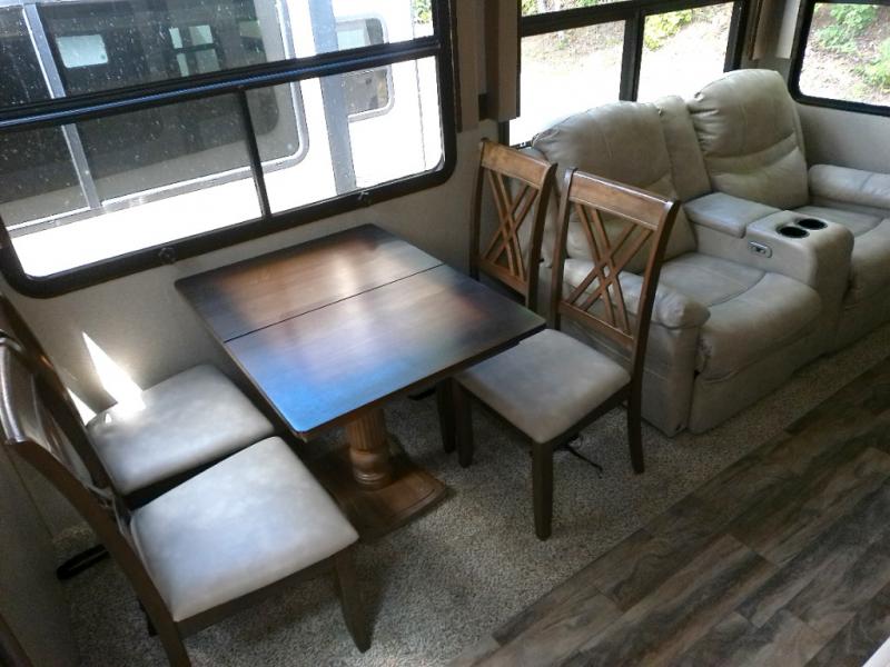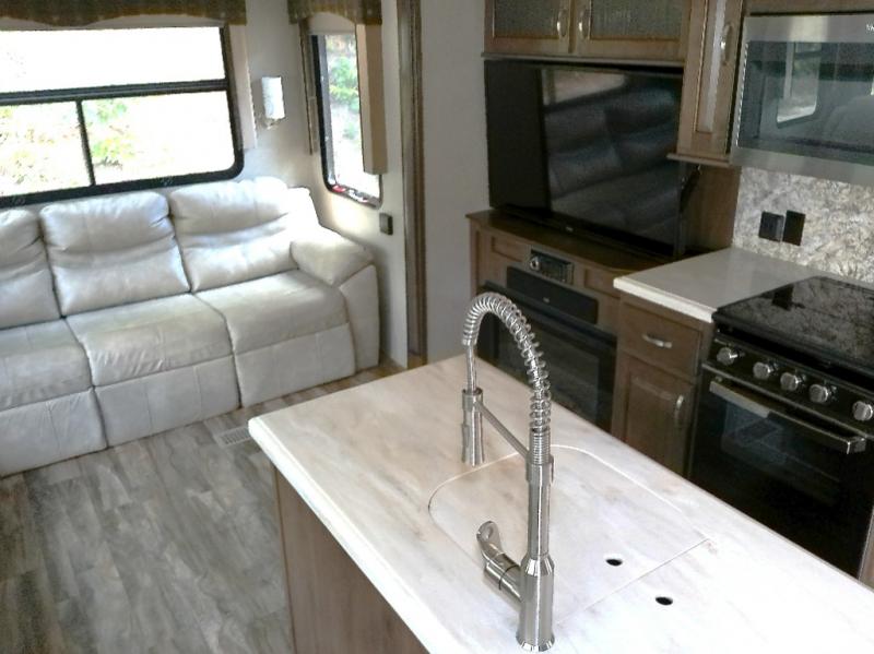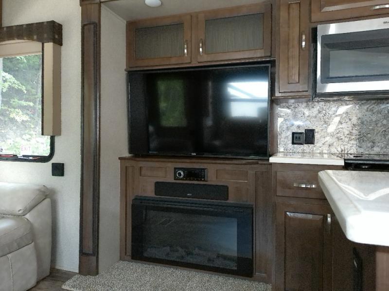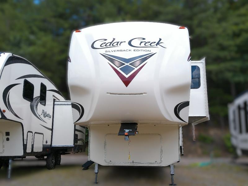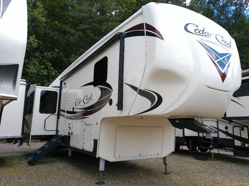 With any Forest River Cedar Creek Silverback Edition fifth wheel you will find Congoleum carefree flooring throughout and in the dining slide there is Shaw carpeting. The kitchen has everything that you would expect to find at home and more from the Furrion chef's kitchen with a gas cooktop, to the full panel backsplash, you won’t be disappointed! The 36" electric fireplace, the Jensen 12 volt CD/DVD/AM/FM/MP3/USB stereo system with a smart control app and Bluetooth, and the 50" LED TV with a swing arm in the living room are sure to be crowd pleasers! Each fifth wheel is constructed with Cedar Creek's famous all aluminum super-structure with a radius wrap metal skirt, and a Z-frame. Plus each comes with a Dexter safety and performance package which includes Dexter axles/brakes/suspension, and a Dexter E-Z flex rubber equalization system with bronze bushings and six greased zerks per side. You are sure to love camping in one of these Forest River Cedar Creek Silverback fifth wheels