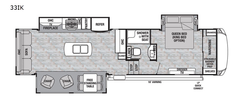 Come see just how fun and comfortable your next camping trip can be with this 33IK Forest River Cedar Creek Silverback fifth wheel. With triple slide outs you will have plenty of living space throughout this model for your family of four. The combined kitchen and living area have plenty of space to relax plus there is a 50” LED TV, an electric fireplace, and plenty of kitchen amenities. Some of these amenities are a three burner range, a 18 cu. ft. stainless steel electric refrigerator, and an island with a double sink and high rise faucet to make clean up a breeze. In the bathroom you can easily get ready for your day. Here you will find a toilet, a sink, a medicine cabinet, and a 48” shower with a seat. Retreat to the front private bedroom where you will find a Denver 8" queen mattress, plenty of storage with the dresser and the front large wardrobe plus there is even an area in the wardrobe that has been prepped for a washer and dryer!