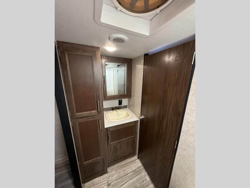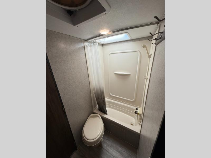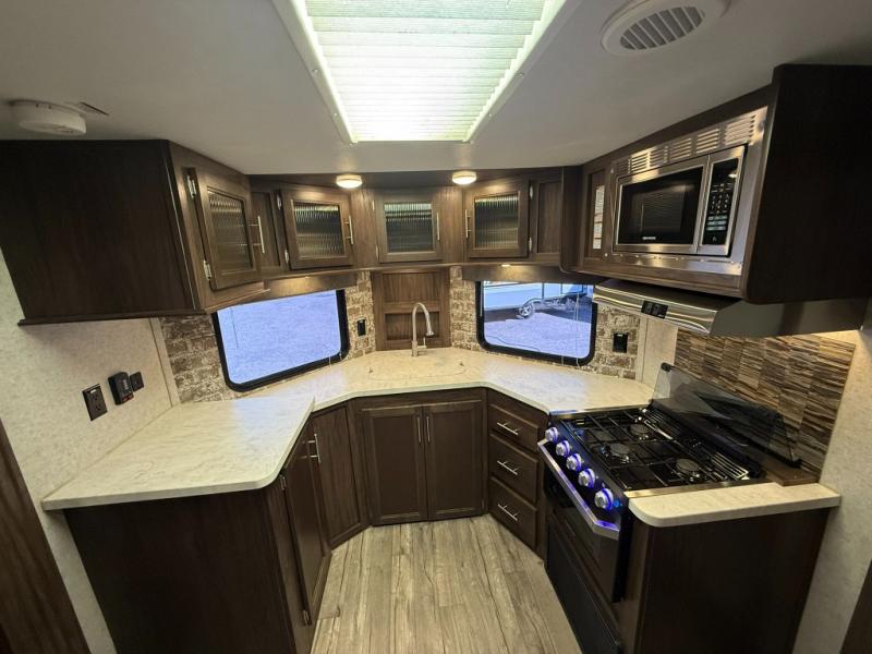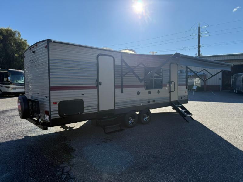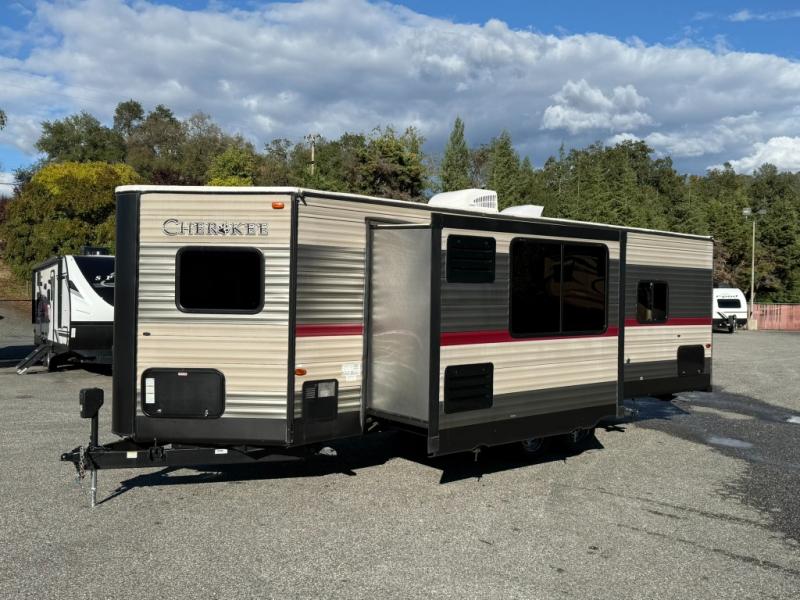 Get ready to enjoy each camping trip with your family when you choose to camp with this V-nose Cherokee travel trailer which allows for better aerodynamics. In the front is the spacious kitchen with plenty of counter space and a large sink to make clean up a breeze. The walk-through bath has doors along either side which adds convenience. You will also find that this model has two entry doors which make it easy to slip out in the early morning and head out to go fishing without waking up your sleeping campers. There is plenty of room to store all of your favorite camping gear in the exterior pass-through storage and additional outdoor storage area!