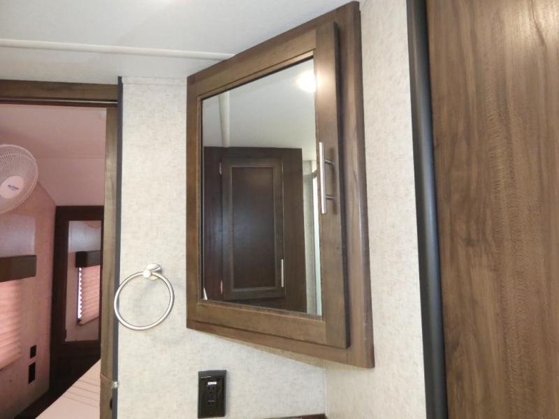 What I liked most: Doors have a bead board look to them adding character. Dark wood cabinetry with brushed nickel hardware looks classy. Two doors into bathroom. Lots of light from windows. Rear kitchen area has decent counter space. Full size pantry with actual hinged door. A travel trailer I could live in for a bit.