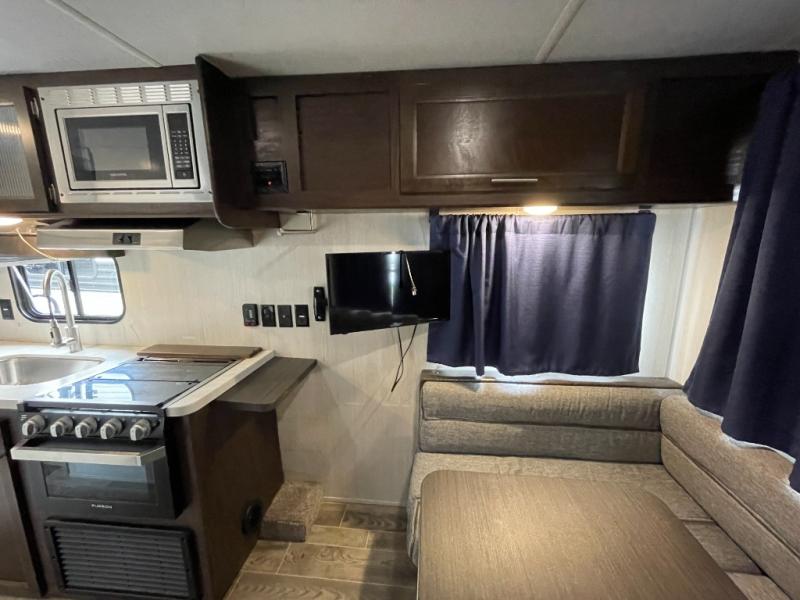 You and your spouse will love this Cherokee Grey Wolf travel trailer for any weekend excursions away from home. The large U-shaped dinette in the rear of the unit makes it easy to invite fellow campers in for an evening snack and a card game or two. It can also easily accommodate extra overnight guests as the dinette folds down to create additional sleeping space for two. The queen bed up front can be made a bit more private with the privacy curtain that can be pulled at night, and the full bath opposite of the entry door is easily accessible from outside. There are plenty of storage options with the overhead cabinets, the pantry, and the wardrobes inside, plus the outside storage!