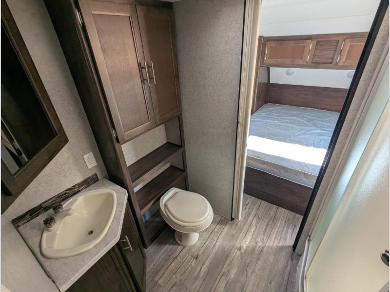 This Cherokee Grey Wolf travel trailer is perfect for your small family and will leave you planning your next outing before you are back from your current weekend away! You will find all of the comforts you need with plenty of livable space including a U-shaped dinette slide. There is also a sofa for more seating when company arrives, plus there are end tables on either side to prevent spills. A spacious walk-through bath leads to a front private bedroom where you will enjoy a great night's rest on a comfortable queen-size bed. You will find ample storage for clothing in the wardrobes that are above handy nightstands for your personal things. There are even lights mounted above the bed on each side which makes it easy to read a couple of chapters before drifting off to sleep.