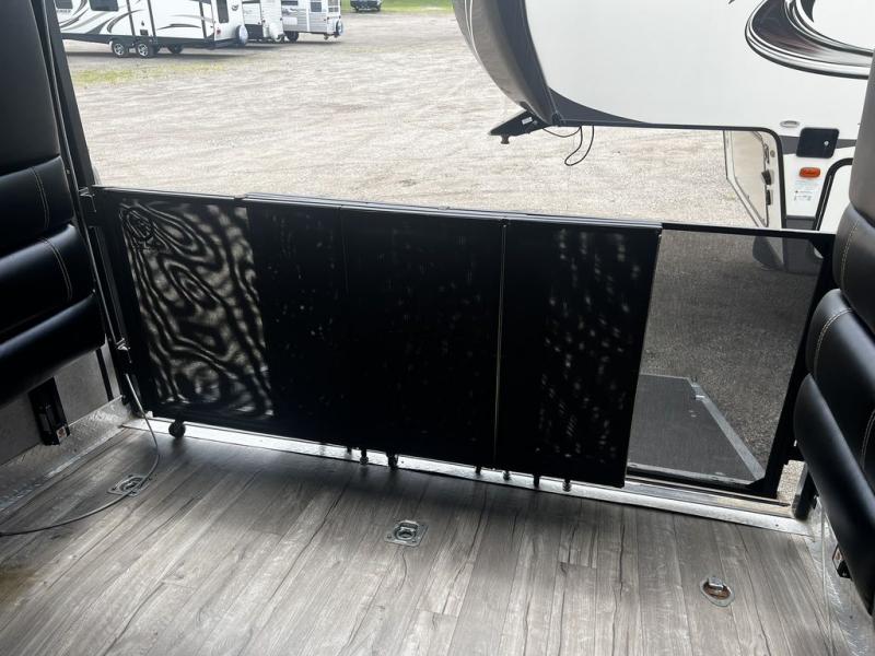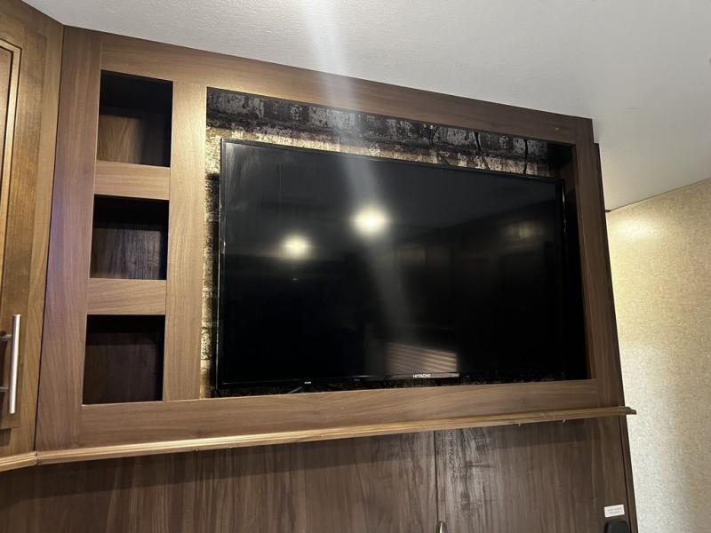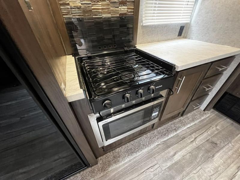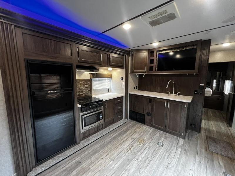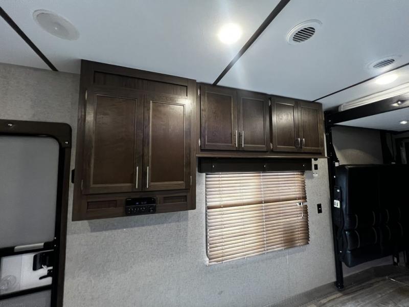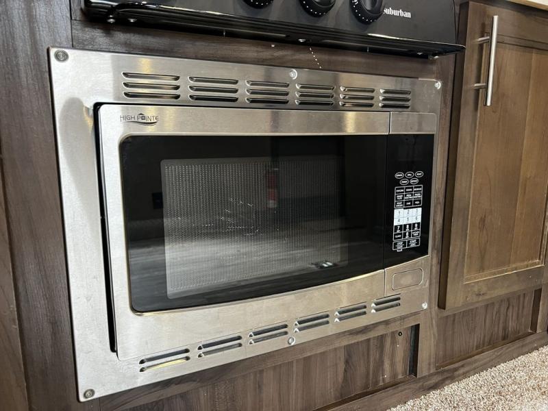 Get ready for any camping excursion with this single-slide Cherokee Wolf Pack toy hauler. There is 15' of storage space for your off-road toys. Once you reach your destination and your gear is unloaded, you can easily set up the sofa beds and removable dinette table and lower the Happijac power bunk. The kitchen features all of the amenities that you would expect to find at home, from the convection microwave to the three-burner range, and when you are ready to turn in for the night, retreat to the private master suite where you will find a queen bed with storage below. Outside you will find more storage, a fuel station, plus a 15' power awning.