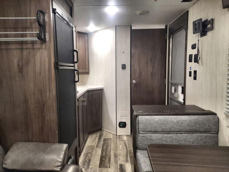 The next time you are in the market for a travel trailer, choose this Cherokee Wolf Pup. The v-nose design allows for better aerodynamics as well as gives you more floor space. This unit features a rear slide out with a queen bed to stretch out on after a long day of exploring. You'll love being able to visit with family on the sofa or share a meal at the dinette. With an overhead compartment and a pantry in the kitchen, you'll have plenty of room for all your dry goods and don't forget the outside storage for larger items! This model also includes a bath with a tub and a shower for easy clean-up. Make your next camping trip great with this Cherokee Wolf Pup travel trailer!