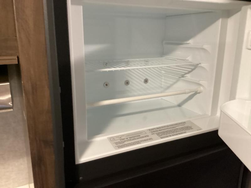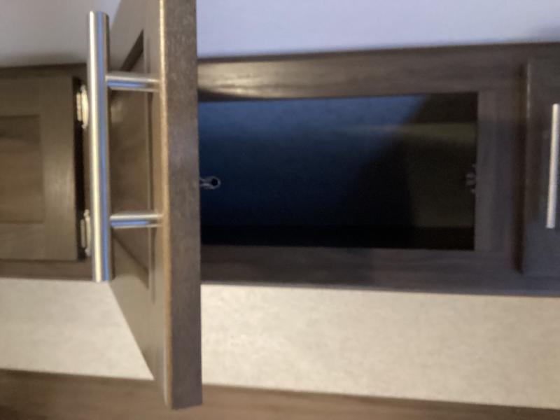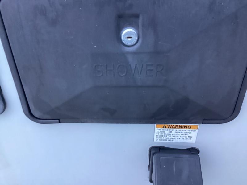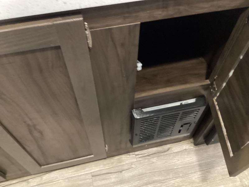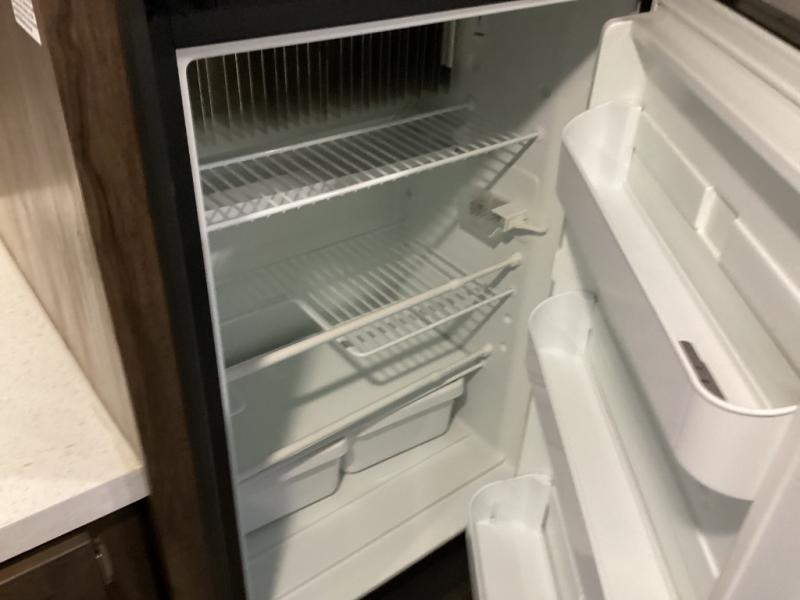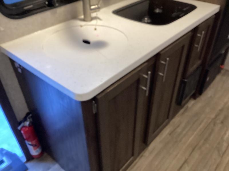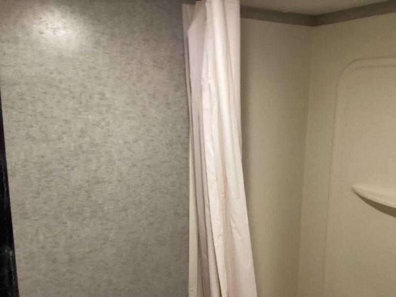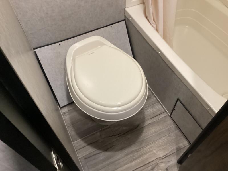 A full bath at the rear offers shower/tub combo and a private space, so you don’t have to rely on campground facilities. -