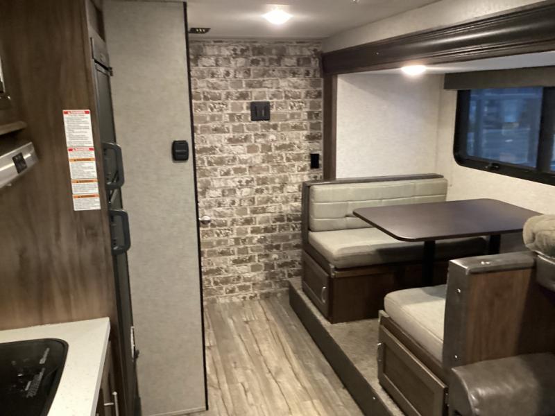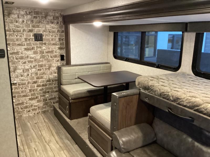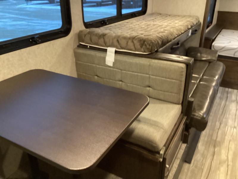 The 18TO features a full slide-out that expands the living area, creating space for dinette seating and a sofa under a bunk — making the interior feel more open when parked. -