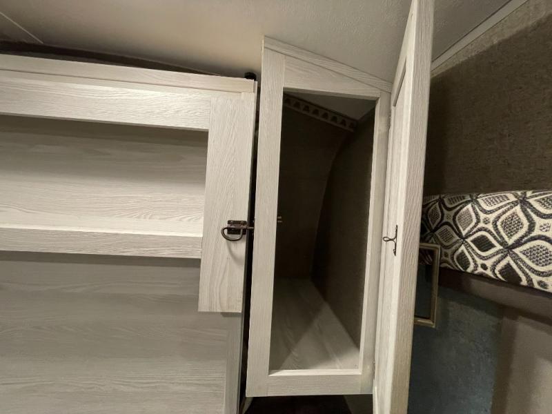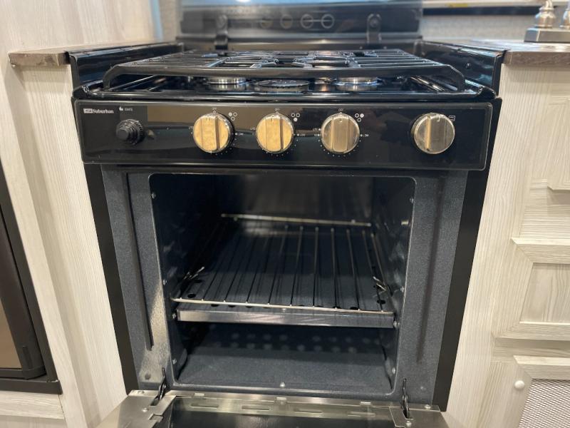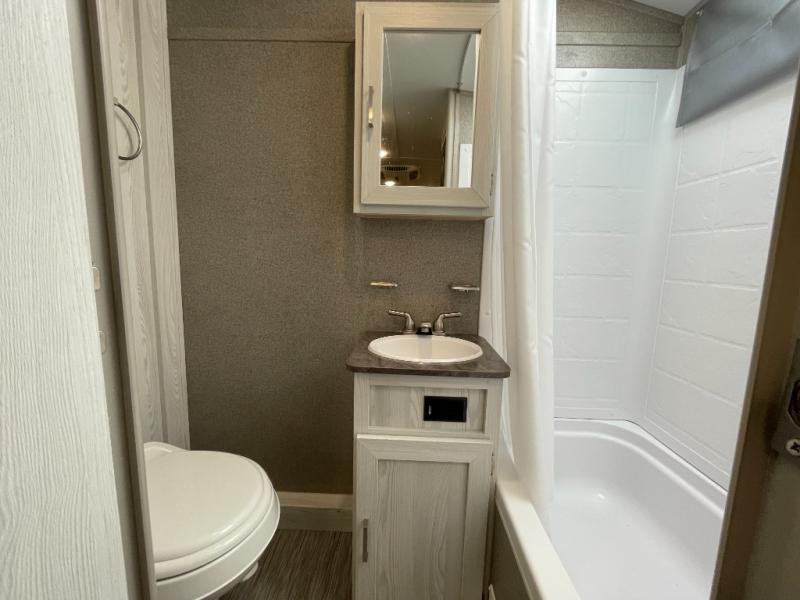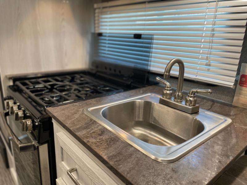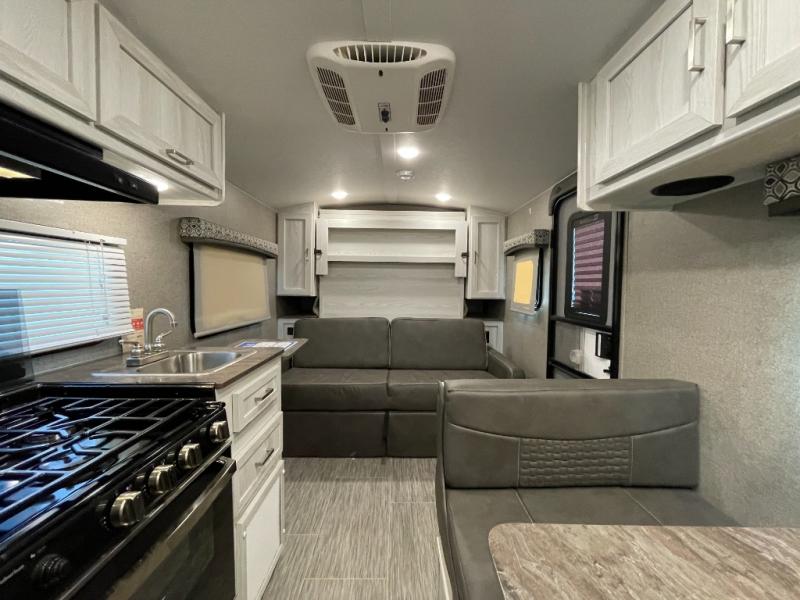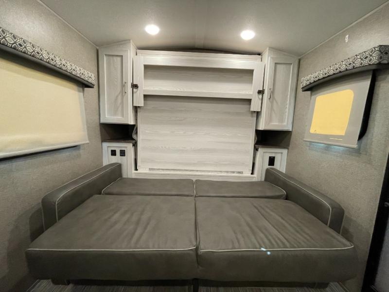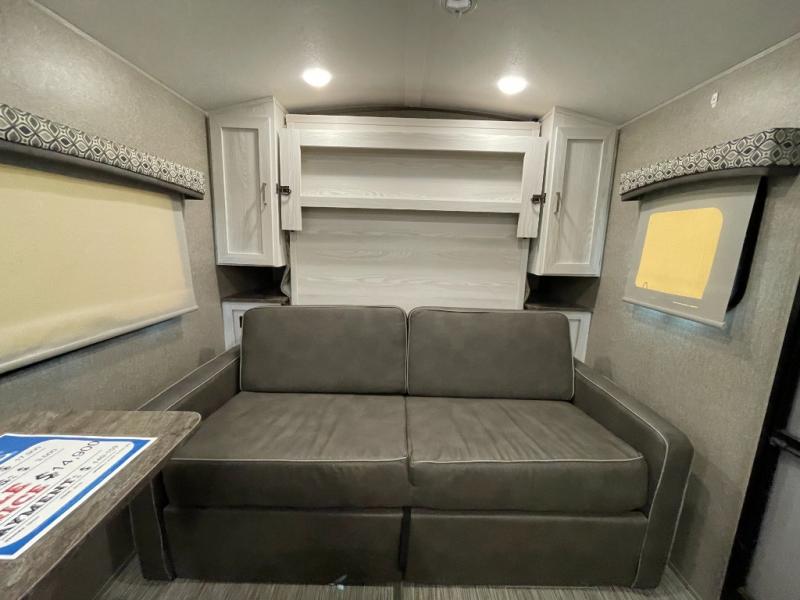 Ready, set, camp! For the camping enthusiast this Flagstaff E-Pro travel trailer by Forest River is ideal for you! You get to choose if you want to sit on the sofa or sleep on the Murphy bed whenever you like. You also have a booth dinette for extra seating and sleeping space. The rear full bath allows you to wash up after a fun day outdoors without having to use the public facilities, and you can cook inside on the recessed cooktop with flush-mount cover and in the microwave or outside on the gas grill.