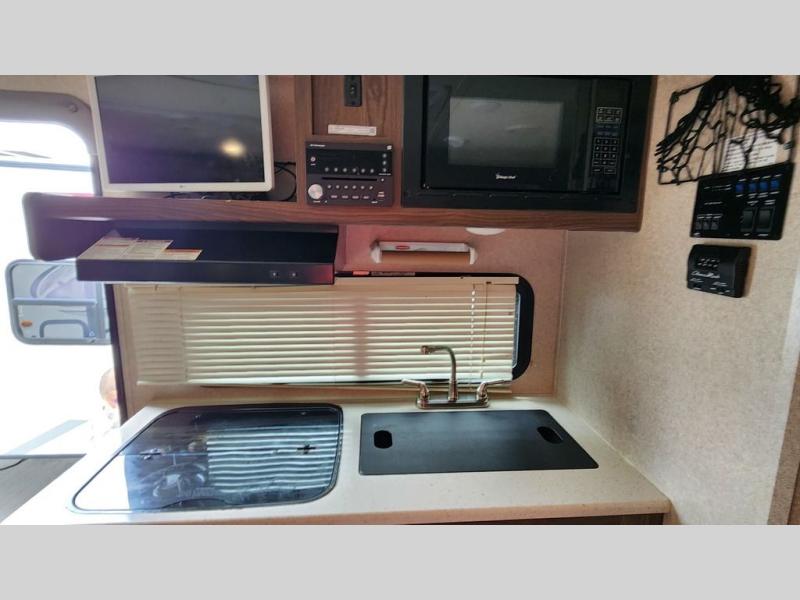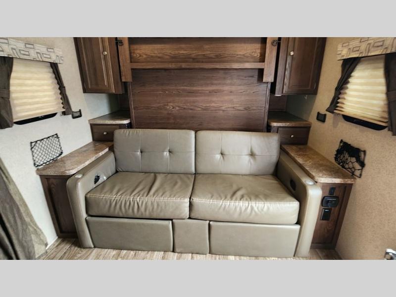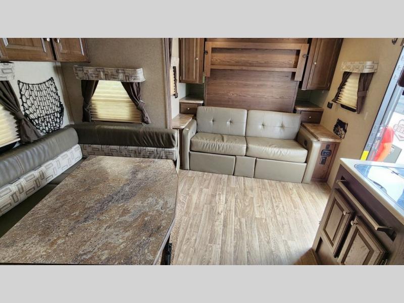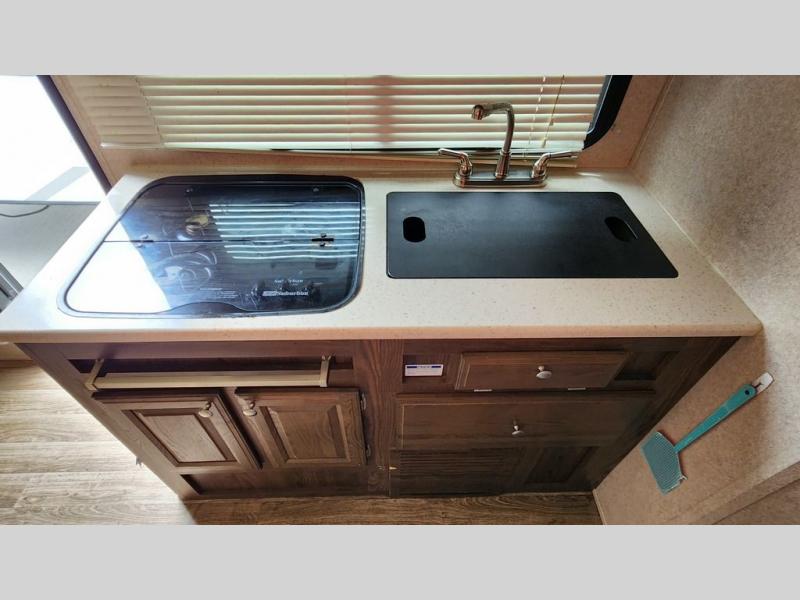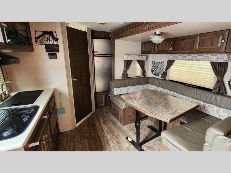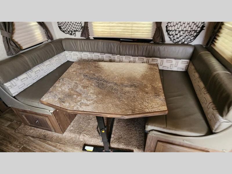 Pack your bags and get ready for your next camping trip with this travel trailer. You will enjoy the space the slide out provides, and within the slide, there is a U-shaped dinette where you can enjoy your meals or this area can double as additional sleeping space. Fold out the Murphy bed each night for a good night's rest and in the morning, you can fold it away and enjoy a cup of coffee on the sofa. This unit features a kitchen with a three burner cooktop, a microwave, and you'll appreciate a pantry for snacks. Bring along the extra lawn chairs with a pass through storage included in this travel trailer, plus there is an exterior storage for your luggage or tackle boxes. After a day hiking, clean up in the convenient rear corner bath. Make this travel trailer yours today!