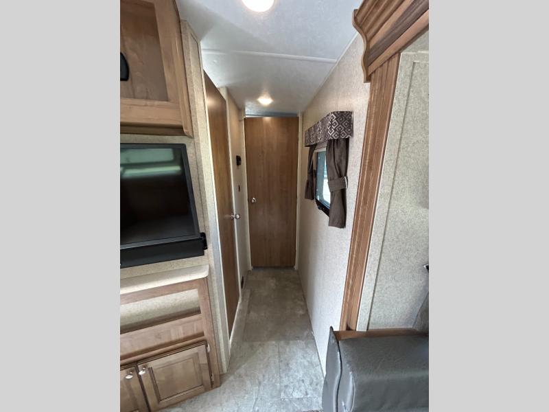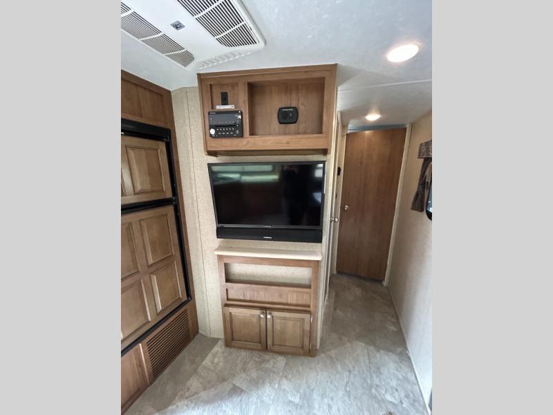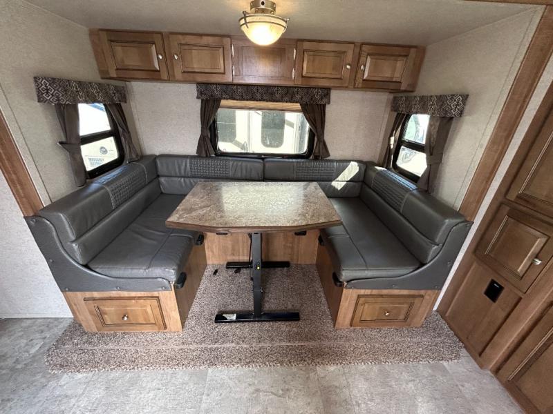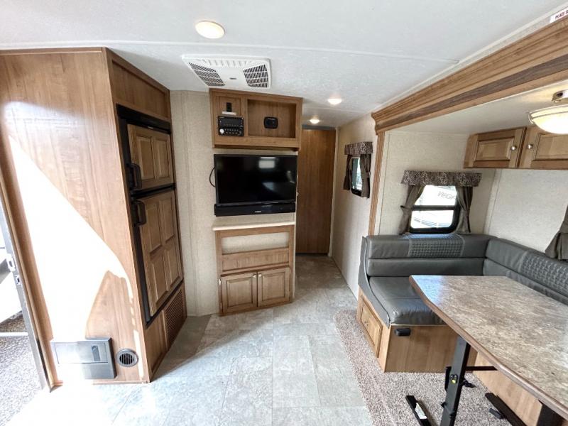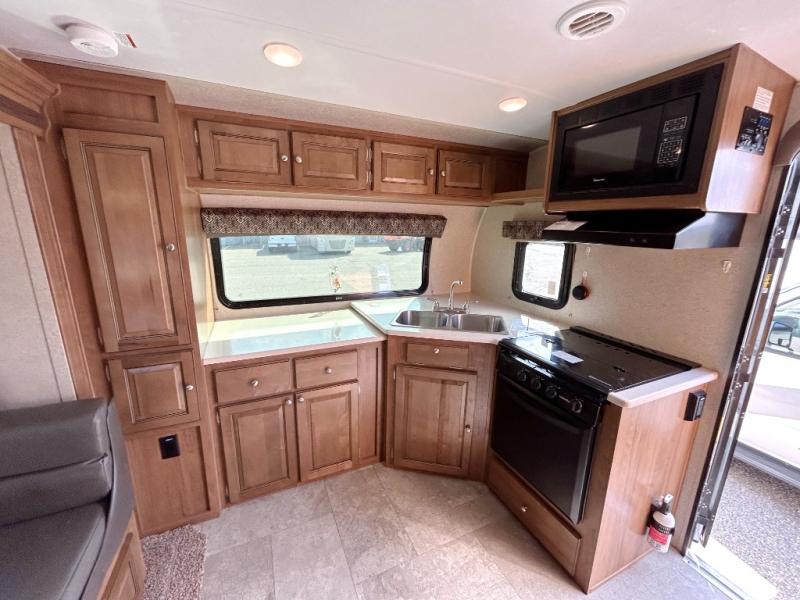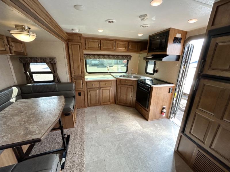 You're going to love this travel trailer with a front kitchen and a rear private bedroom. With sleeping space on the large U-shaped dinette or the queen bed, you can comfortably sleep four in this unit. The single slide out with the U-shaped dinette opens up the living area and provides extra room in the front kitchen area to cook your family dinners. You'll appreciate the pantry, as well as ample counter space to prep your meals. Enjoy your evenings surrounded by the fireplace or the 32" LCD TV makes it a movie night with popcorn and snacks. This model also includes a pull-out grill with a spray port for breakfast outside!