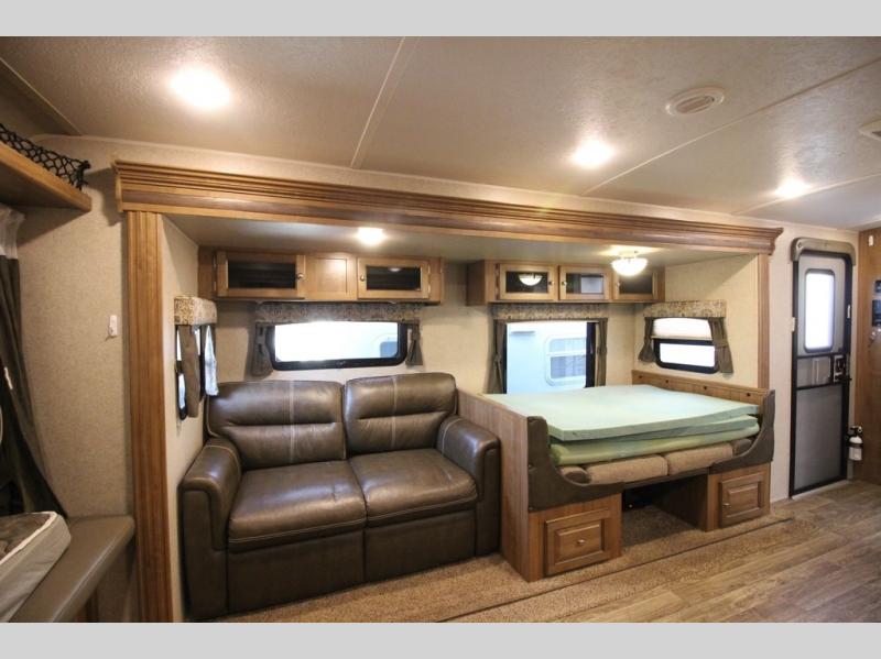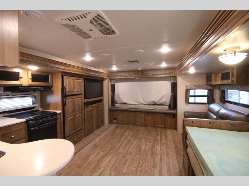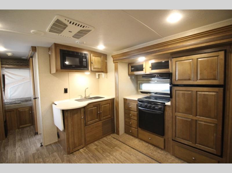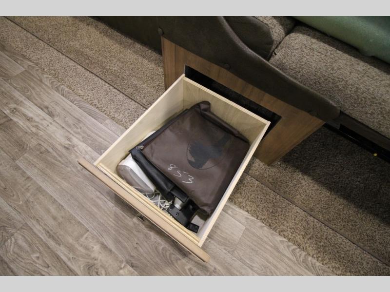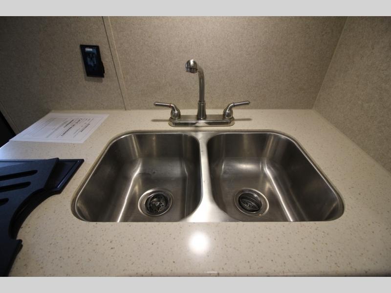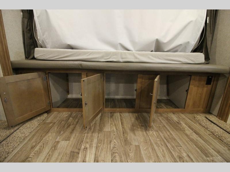 If you seek adventure outside and space to walk around inside your own RV then check out this expandable. The two tent end beds and dual opposing slide outs allow everyone plenty of floor space to move about without squeezing in. You will also find enough sleeping space for seven or eight on the beds, and the furniture if you include the bench seat. You can watch the swing-out 43" TV while cooking, or playing cards at the dinette. There is a counter extension, full bathroom, exterior storage, and even a gas grill option to enjoy!