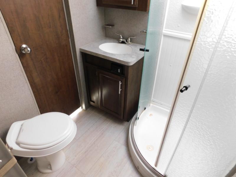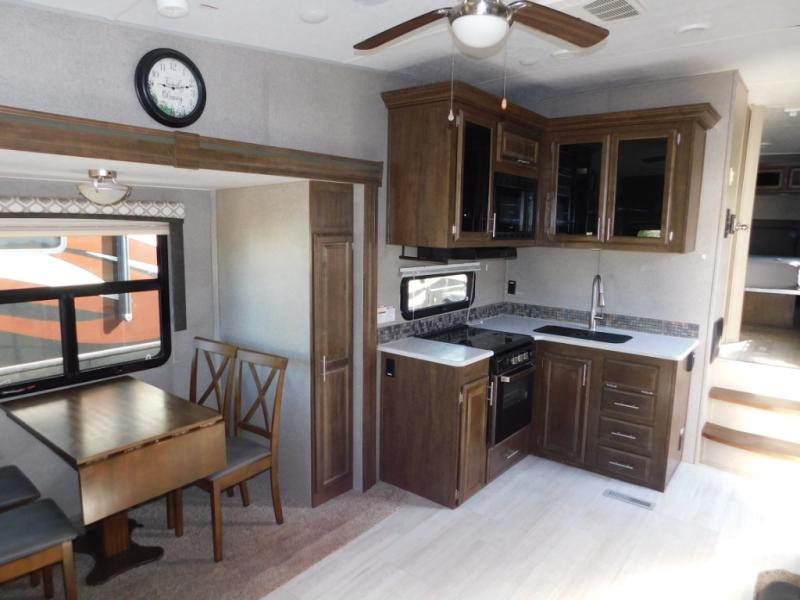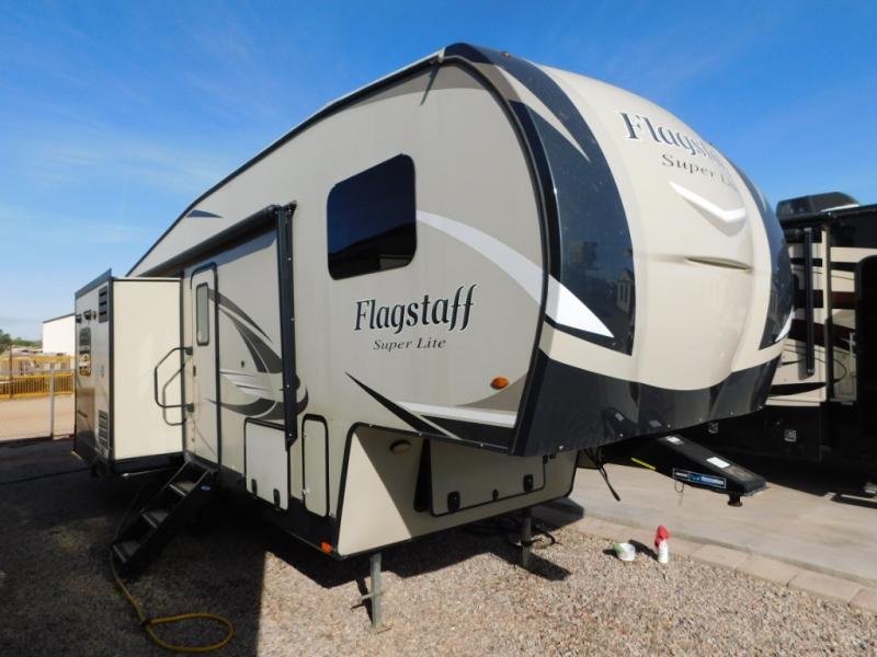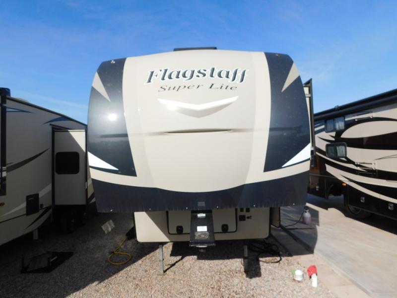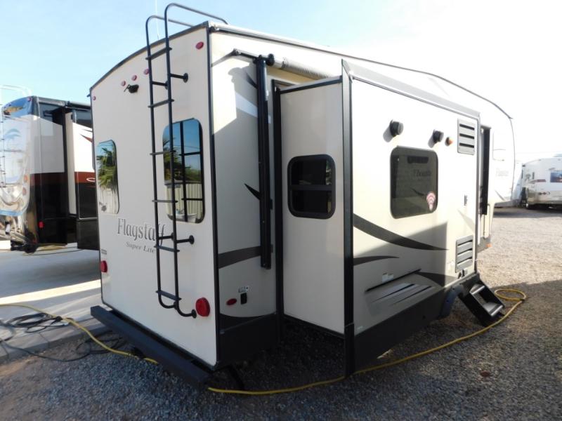 It will be easy to make plenty of memories with your family when you choose to camp with a Flagstaff Super Lite fifth wheel by Forest River. These models have beautiful slatewood cabinetry with solid wood cabinet doors and drawers, a LCD TV with an upgraded soundbar speaker system, and flush mount ceiling LED 12 volt interior lighting with multiple switches. The 6 sided aluminum cage construction offers lightweight towing, the radius roof with interior vaulted ceilings give you more headroom, the WiFi ranger Sky 4, the enclosed underbelly, and the power awning with adjustable rain dump and LED light strip, will give you years of enjoyment!
