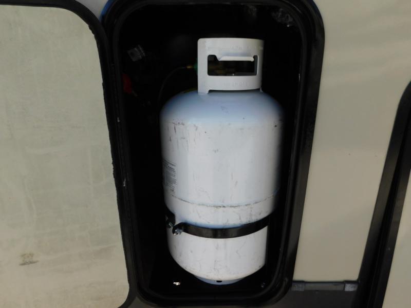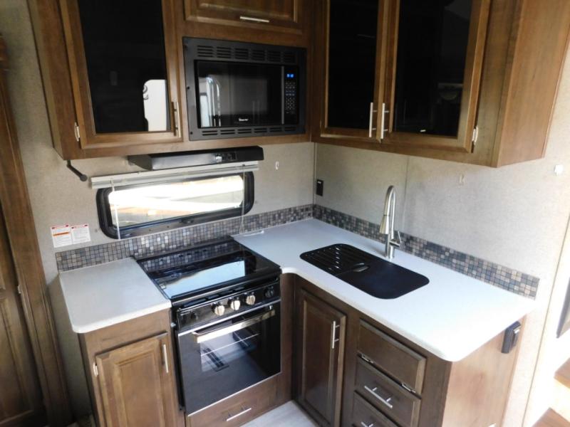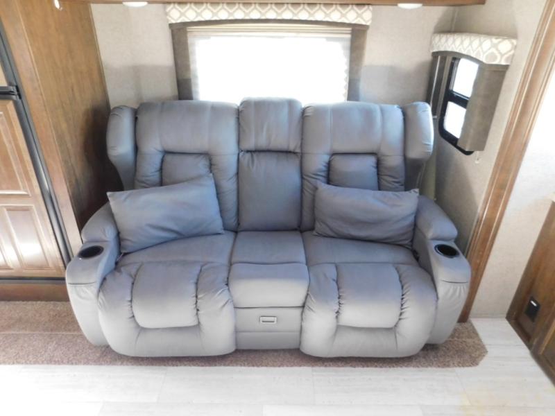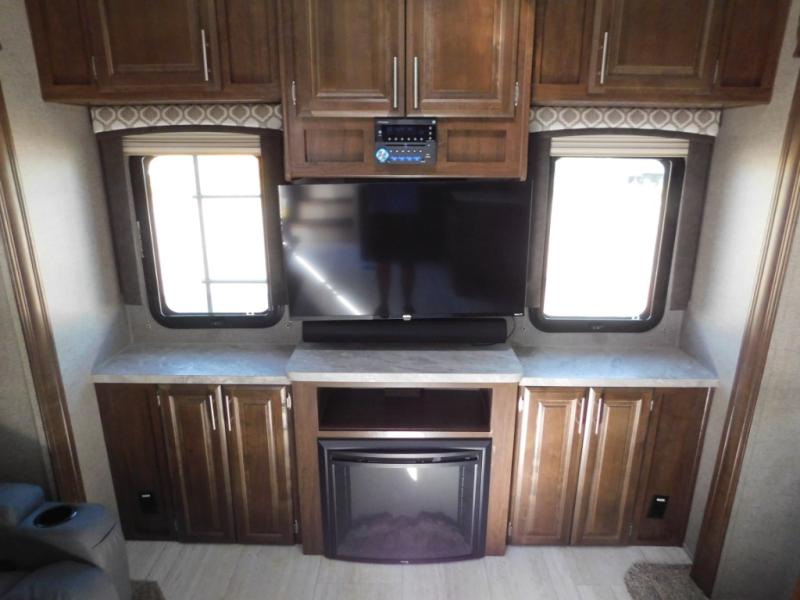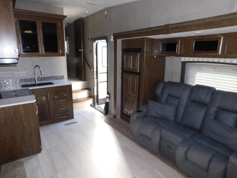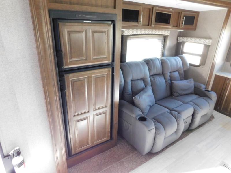 See how easy your next camping trip can be with this triple slide out fifth wheel. In the evening you can plan to relax in the living area at the 76" hide-a-bed sofa or at the dinette. You might even decide to choose the optional theater seating and/or the free standing dinette option if you like. From the furniture you can easily watch the TV that is located along the rear wall which also includes an entertainment center and fireplace. You will love the L-shaped kitchen when making meals, the convenience of the double entry bathroom, and the master bedroom's storage. Outside you will find pass-through storage for your larger camping items, a gas grill, and even a ladder along the rear. Take a look!