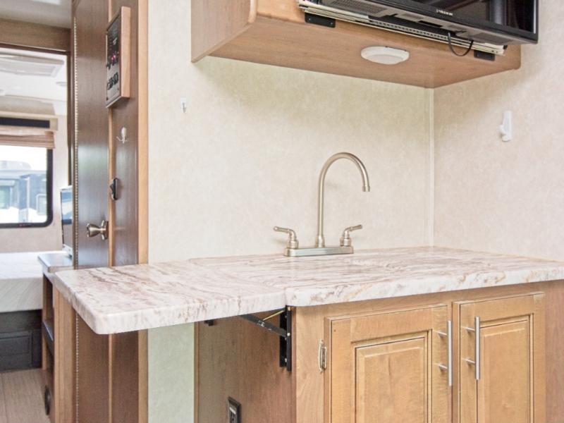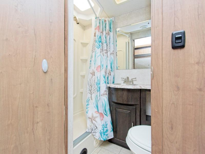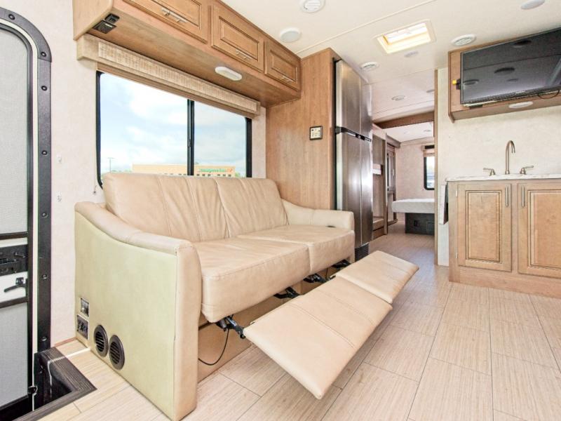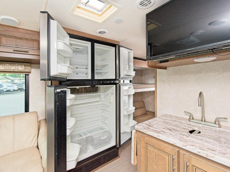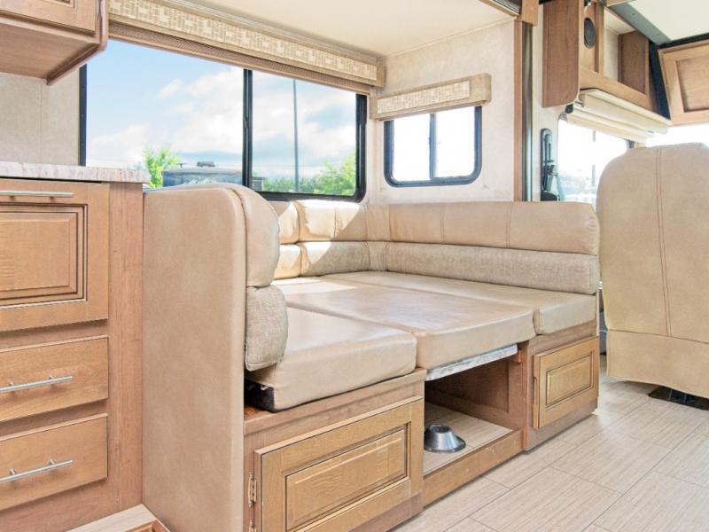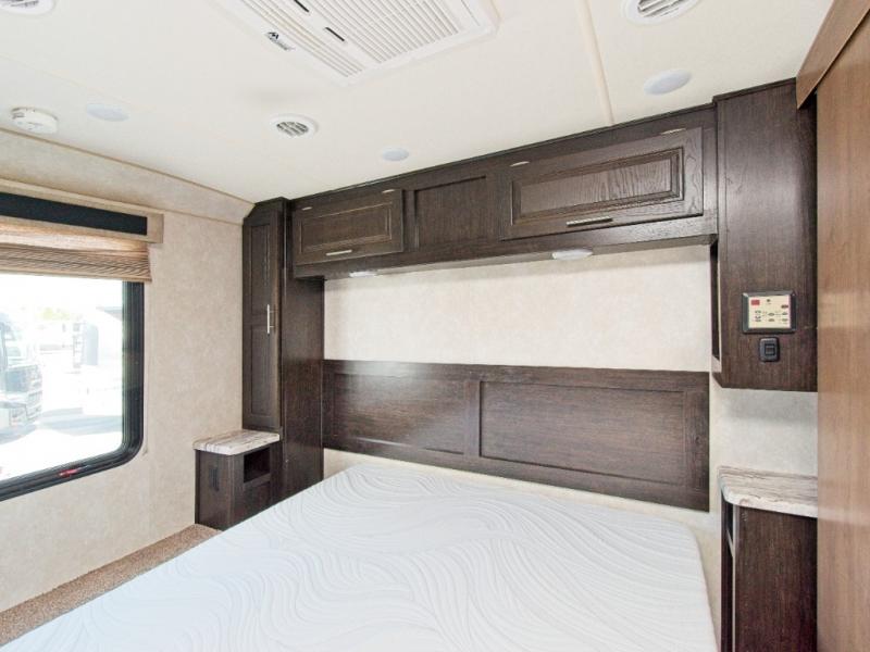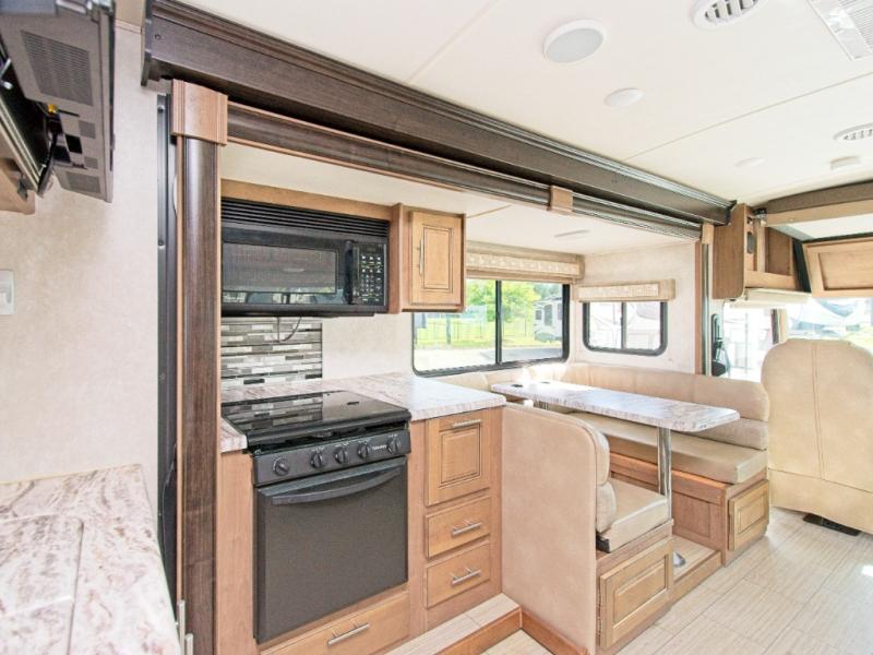 The FR3 Crossover Class A gas motorhome by Forest River is equipped with the latest modern amenities. LED interior lighting keeps the coach bright and welcoming, even on gloomy days. The 6' 10" ceiling provides plenty of headroom, allowing you to move freely without worry. Outside, the motorhome offers an entertainment center for watching the big game, marine-grade exterior speakers for your favorite music, and an electric awning with LED lights for outdoor gatherings.