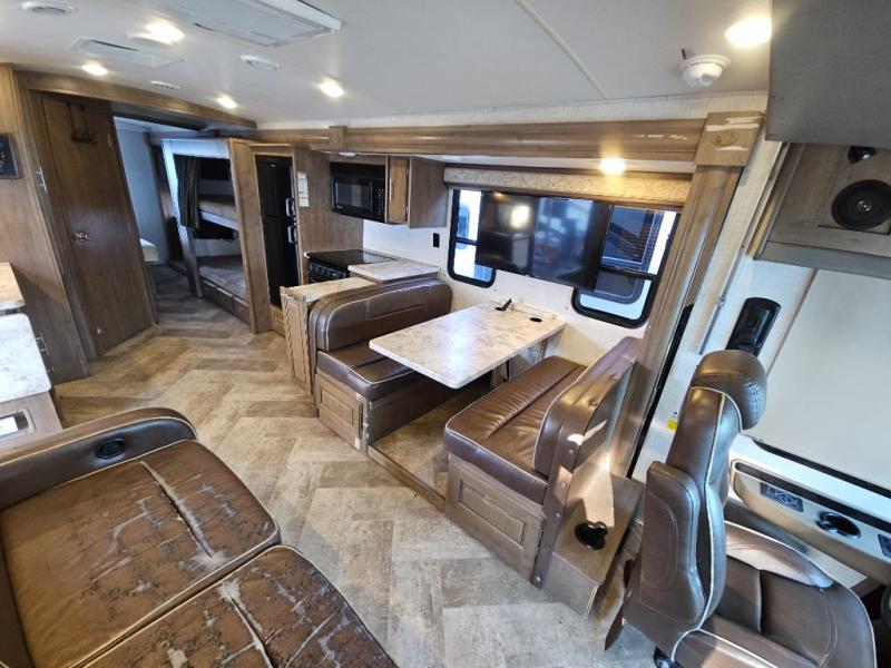 A full wall slide out and plenty of comfortable living space is what you will find in this Georgetown 3 Series GT3 31B3 class A gas motorhome by Forest River. Your kids will enjoy the bunk beds and mom and dad can get a good night's rest on the rear queen bed. For your enjoyment you can watch TV at the 40" LED TV in the living room or the 24" LED TV in the bedroom. Maybe you have a little work to do while you are away from home, well the passenger work station is the ideal spot to set up a laptop or ipad.