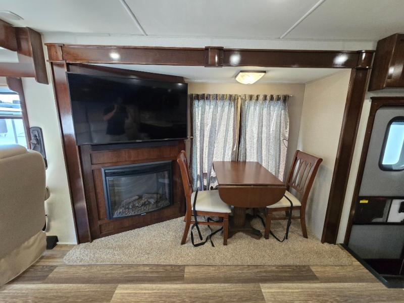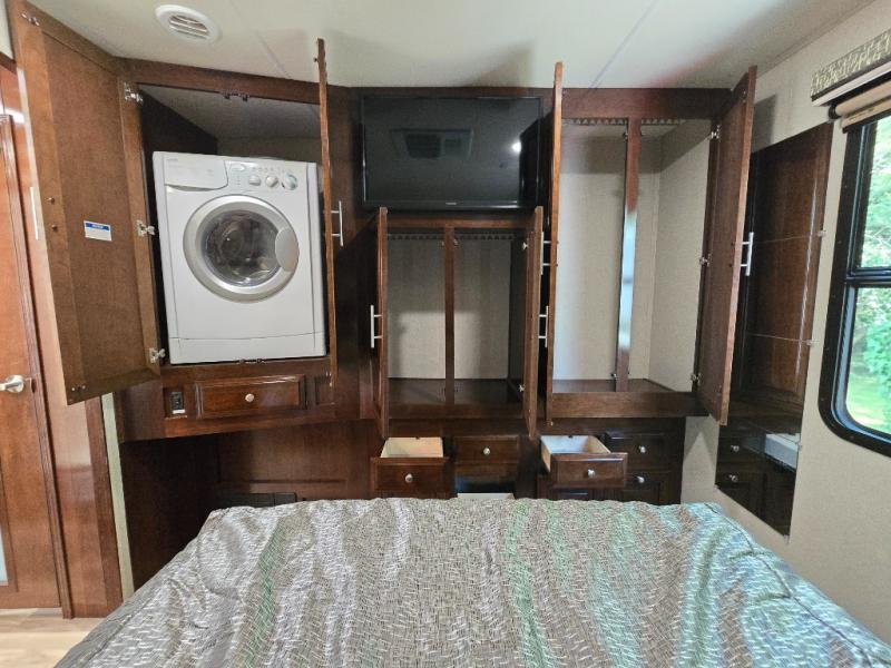 For your next camping trip, whether near or far, you will want this spacious triple-slide Georgetown XL Class A gas motorhome by Forest River. Once you reach your destination, you can relax in the living area where you will find a three-person theatre seat, a 50" LED TV, and a fireplace. The private bedroom has a queen-size bed, a large wardrobe, and you can choose to add an optional washer and dryer.