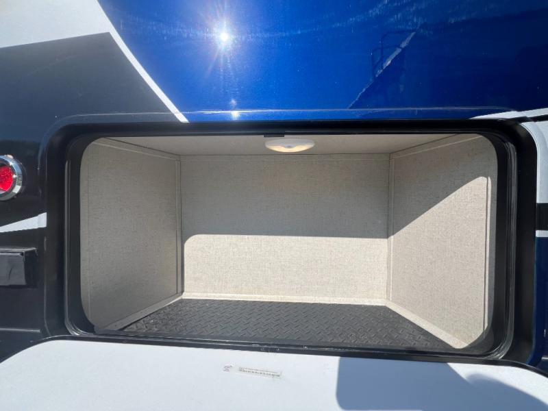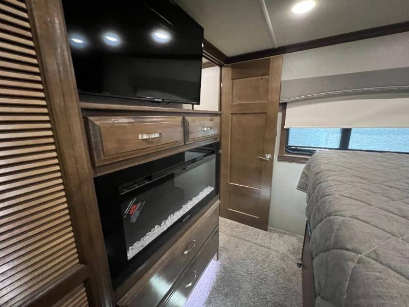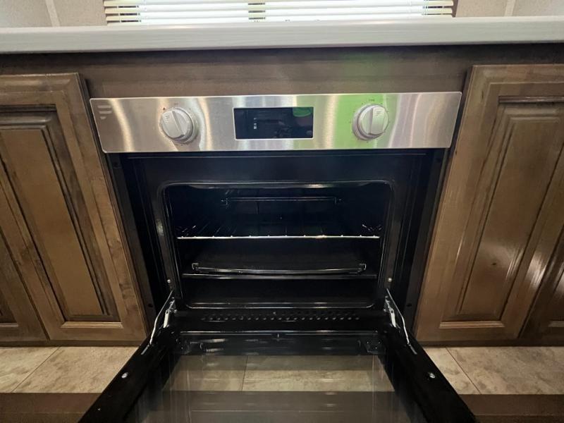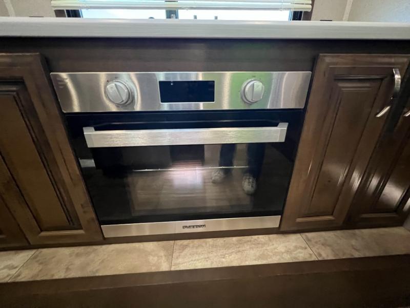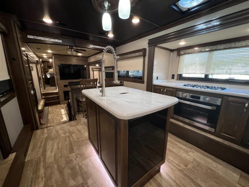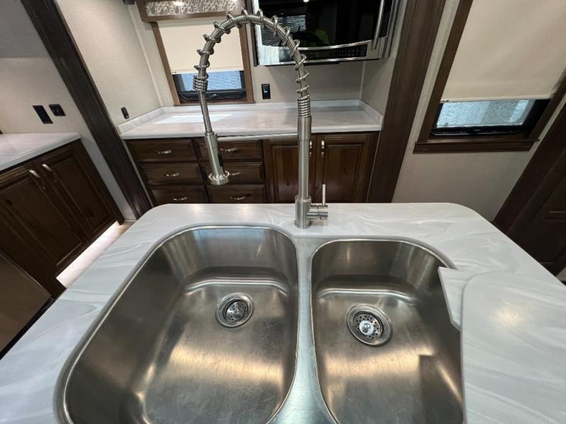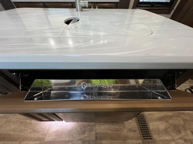 This RiverStone 39FKTH toy hauler fifth wheel gives you all of the at-home comforts plus the convenience of bringing along a few dirt bikes or a four wheeler. Whether you are traveling near or far you can easily load an unload your big toys with the zero gravity ramp door. After you are done playing outside for the day then come relax in the living area where you will find two hide-a-bed sofas and a set of theater seats. You can warm up at the fireplace or enjoy watching a movie or show at the 60" LED Smart TV with a premium soundbar and DVD player/stereo. In the front kitchen you will find plenty of counter space for meal prep as well as an island with a double sink and a dishwasher for cleanup to be a breeze!