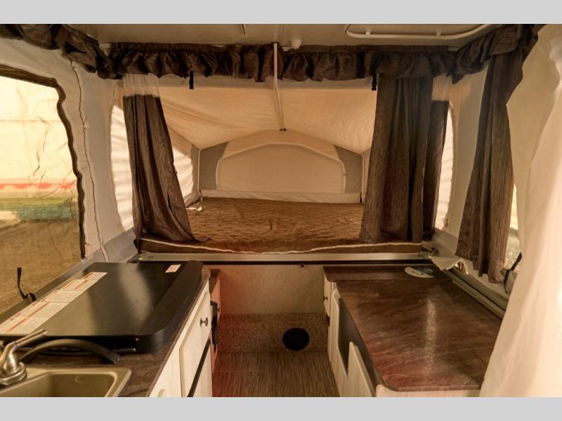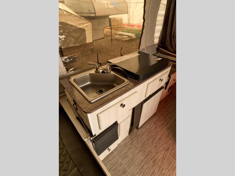 You will find plenty of space inside this 2280BHESP Rockwood Extreme Sports folding pop-up camper by Forest River. With a rear queen size tent bed, and a front king bed you will have enough sleeping space for your family. Plus there is an exterior front deck storage with an expanded metal deck for storing your toys and outside gear! At the swing galley, you can easily clean up in the sink and fix quick meals or a snack at the three burner range, plus there are two cabinets for you to store all sorts of goodies. If you dislike using public facilities, then add the optional shower/port-a-pottie option and make your trip that much more enjoyable!