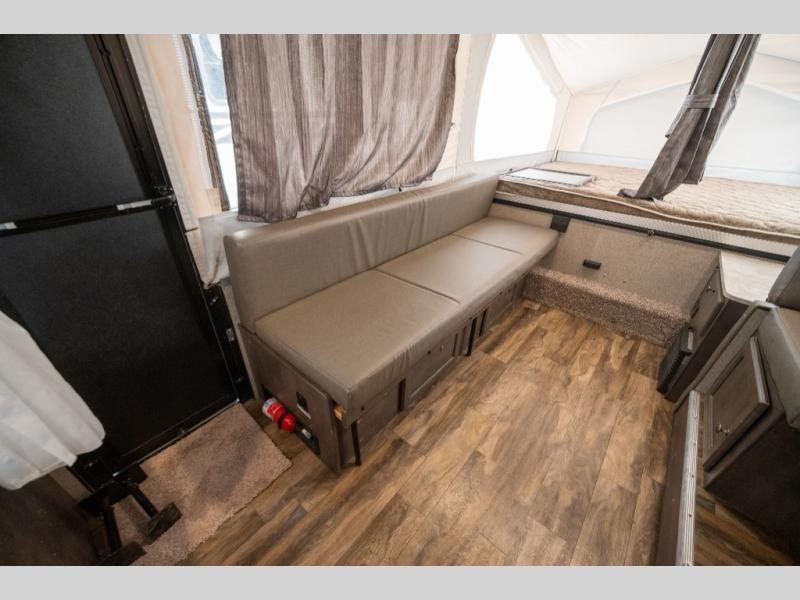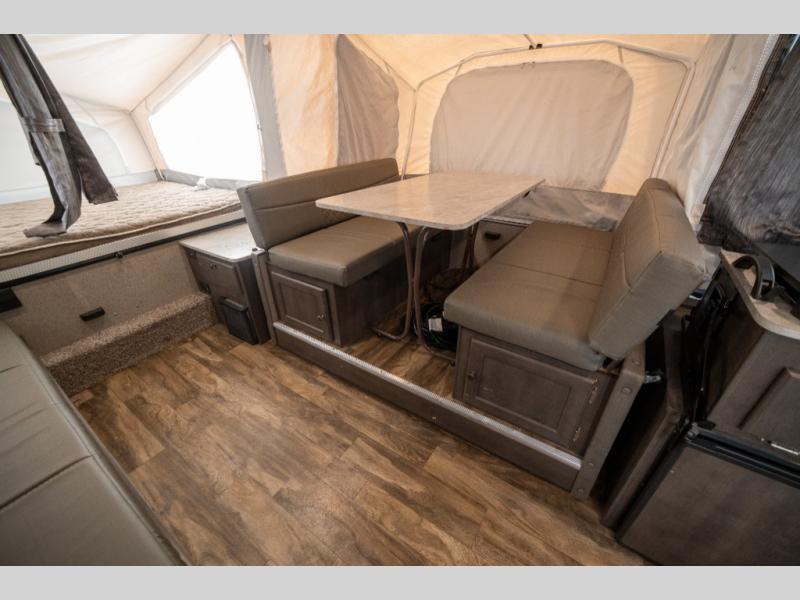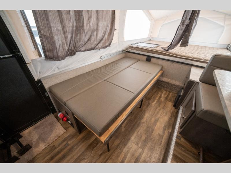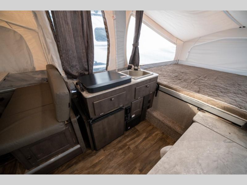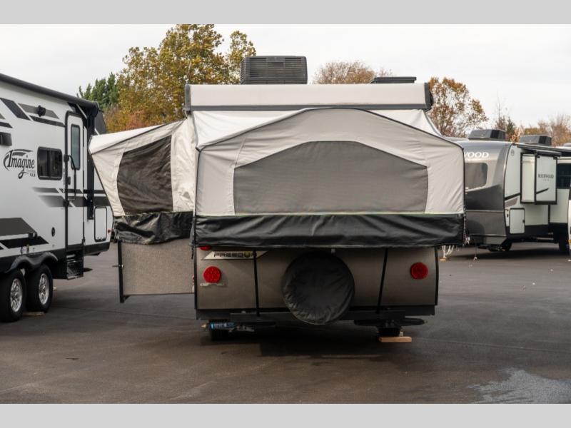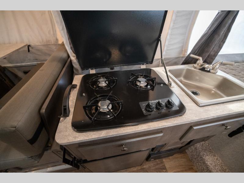Forest River's Rockwood Freedom Series tent campers make time spent with family and friends exactly what it should be - relaxing, enjoyable and easy to do! These units offer luxurious features from home such as the quilted top mattresses, the residential style cabinet doors, wood drawers with full extension metal guides, and the leather appearance seating, plus the wood look flooring throughout. Each unit has kitchen amenities for you to whip up your best meals like the permanently mounted 3-burner indoor range with cover and the 3 way 1.9 cu. ft. refrigerator. They also feature a one piece fiberglass vacuum bonded fiberglass roof with a metal interior ceiling, a one-piece undercoated structure wood floor, a five piece sectionalized Vinolon Supreme tenting, full perimeter aluminum bed frames, and tinted vinyl windows.