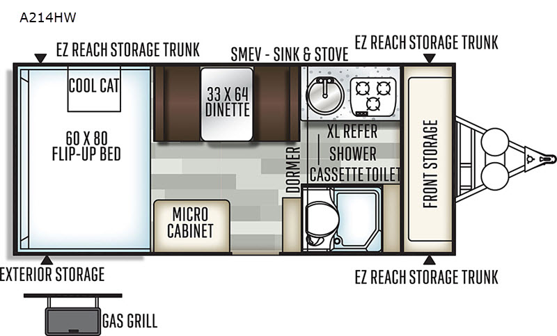 Don't miss out on an exciting adventure with this Forest River A214HW pop-up camper! You will enjoy a good night's rest on the flip-up bed with a heated mattress for you to stay nice and warm any time of the year. In the front, there is a dormer for you to move around more freely in the kitchen. When it's time to get cleaned up, you can do so indoors with the shower cassette with toilet. If you are craving the perfect juicy burger then head outside and use the outdoor grill and satisfy your hunger!