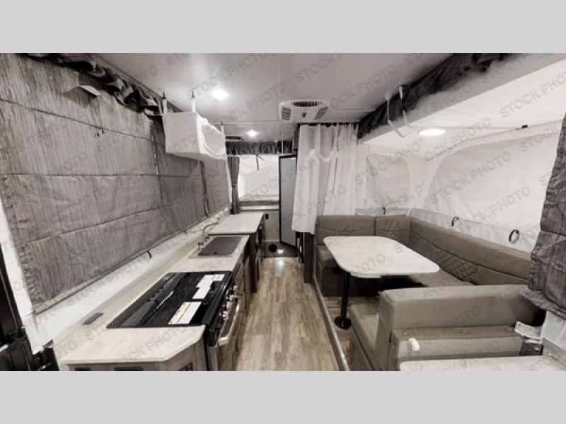 If you want an adventurous camping experience then pop into this Forest River Rockwood High Wall HW277 folding pop-up camper! It features a front king and a rear queen tent bed for sleeping, plus there is also a U-shaped dinette that you can eat your meals at or convert into an extra sleeping space. The grill master of your group will enjoy cooking on the outdoor gas grill with work table and the interior LED lighting brightens your way to a good camping trip!