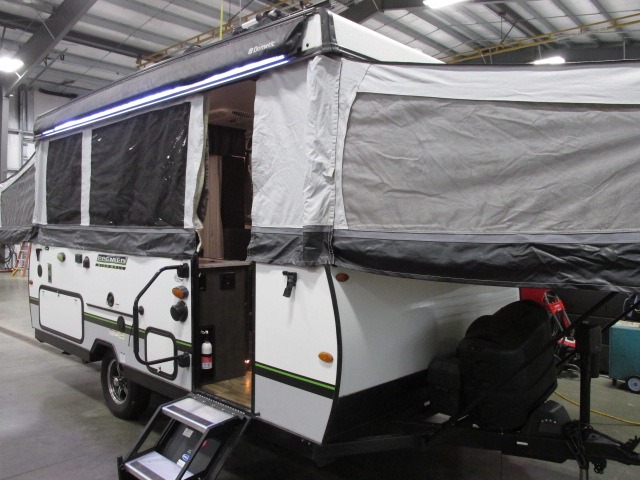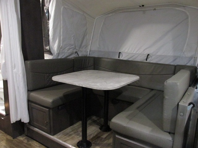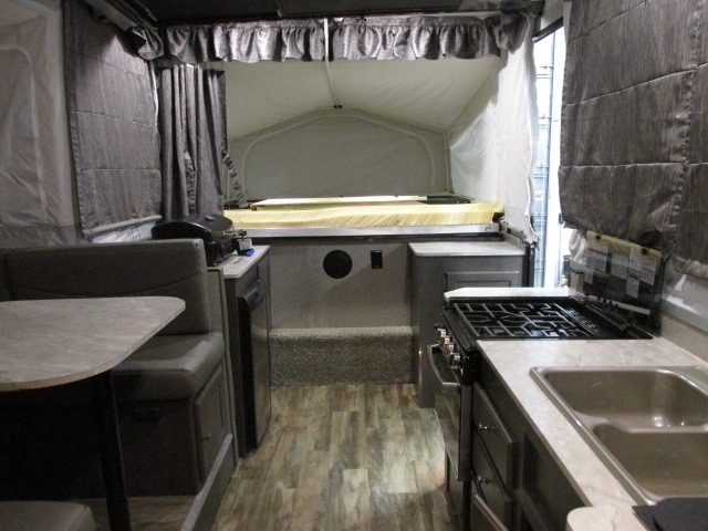 If you want an adventurous camping experience then pop into this Forest River Rockwood High Wall HW277 folding pop-up camper! It features a front king and a rear queen tent bed for sleeping, plus there is also a U-shaped dinette that you can eat your meals at or convert into an extra sleeping space. The grill master of your group will enjoy cooking on the outdoor gas grill with work table and the interior LED lighting brightens your way to a good camping trip!