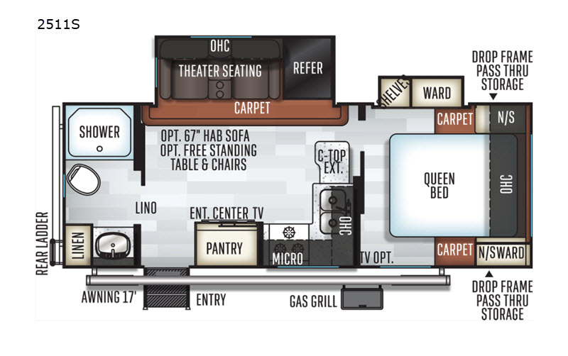 This Forest River Rockwood Mini Lite 2511S travel trailer has a front private bedroom which makes this unit the perfect couple's get-a-way! You could take a short trip or an extended stay, whether you choose a secluded place in the woods, a campground, or a place by the beach I am sure you will love your vacation. The two slide outs provide plenty of walking about space in this unit and you can relax to the fullest with the heated theater seats with cupholders and USB ports. You will also love the convenience and added privacy of the rear bath, plus it has a linen closet for you to keep your linens handy. You can whip up your best meals with ease whether you choose to do so indoors or outdoors on the gas grill, and you can conveniently serve them on the kitchen countertop extension. There is even a 17' power awning to protect you from getting a sunburn and LED lights for you to see clear as day even at night.