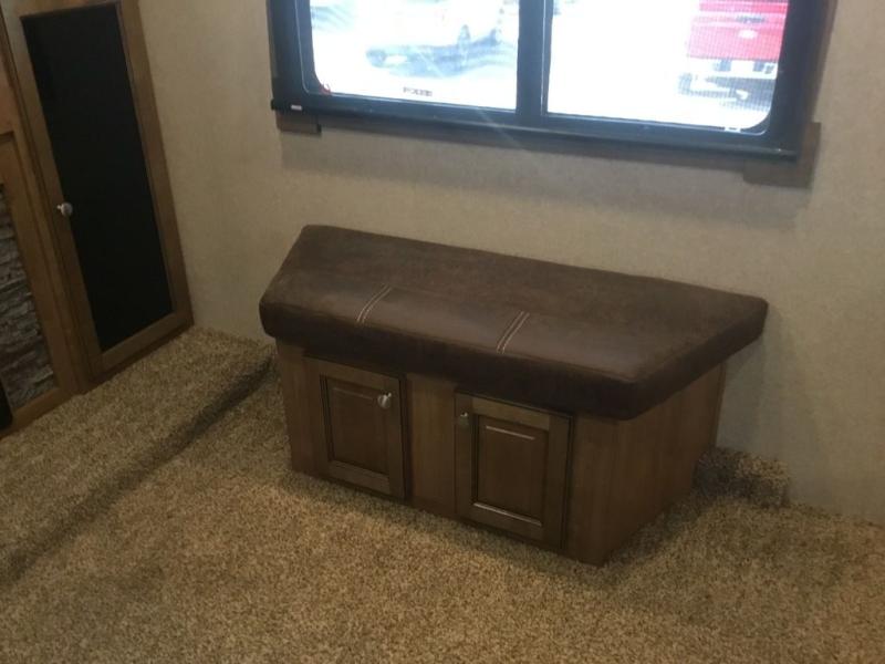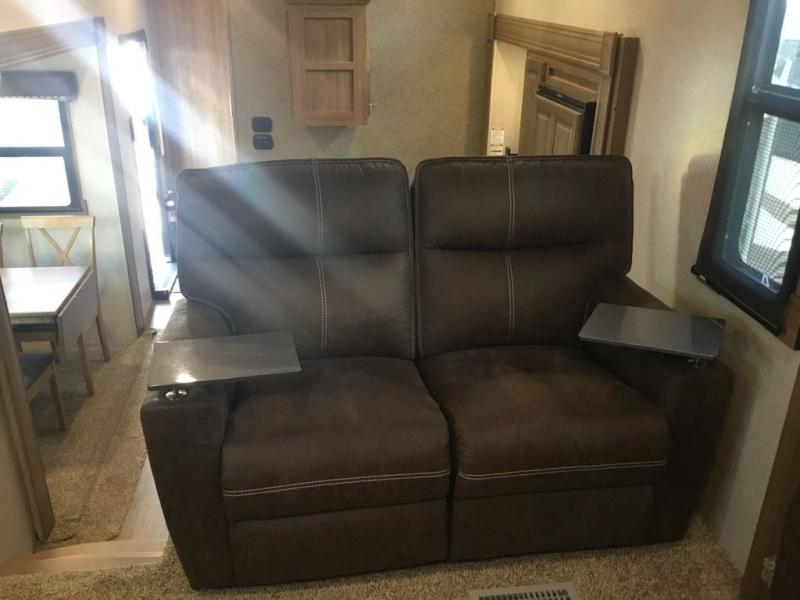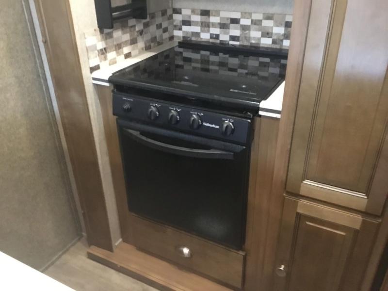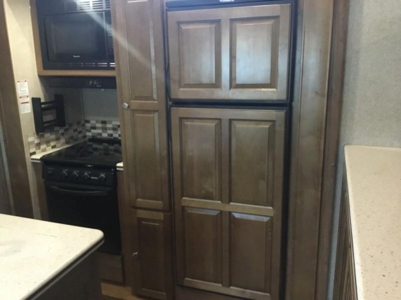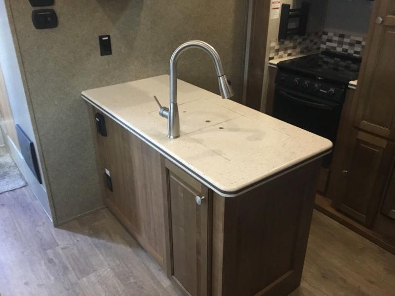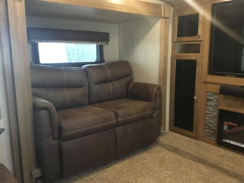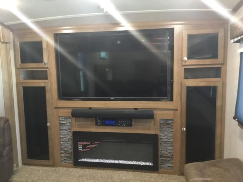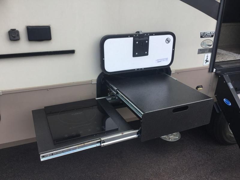 See just how easy and fun camping can be with this fifth wheel with four slide outs. Straight in from the door is the bathroom where you can easily get ready for your day. The rear bedroom is a spot where you can find comfort and rest. Here, you'll find a Serta queen bed, a large wardrobe, and you can add an optional TV. The kitchen area features dual opposing slide outs and plenty of room to move about while you fix your meals, plus a counter peninsula. In the evening plan to retreat to the front living area where you can watch your favorite movie or show at the large entertainment center, plus there is a fireplace which is nice for those chilly evenings. Within the roadside slide out there is a 60" hide-a-bed sofa where your kids or guests can sleep at night. This fifth wheel also includes a mini outside kitchen the chef of the family will love!