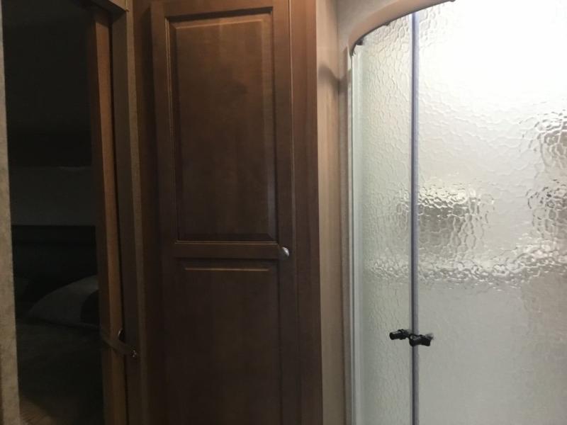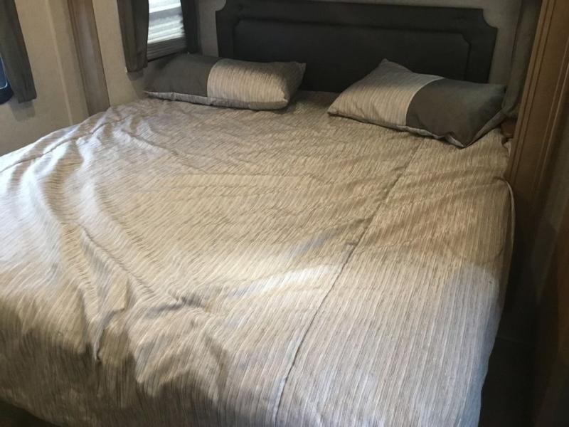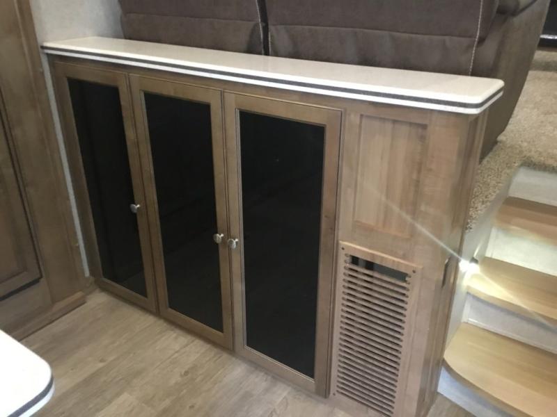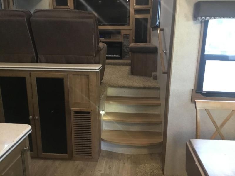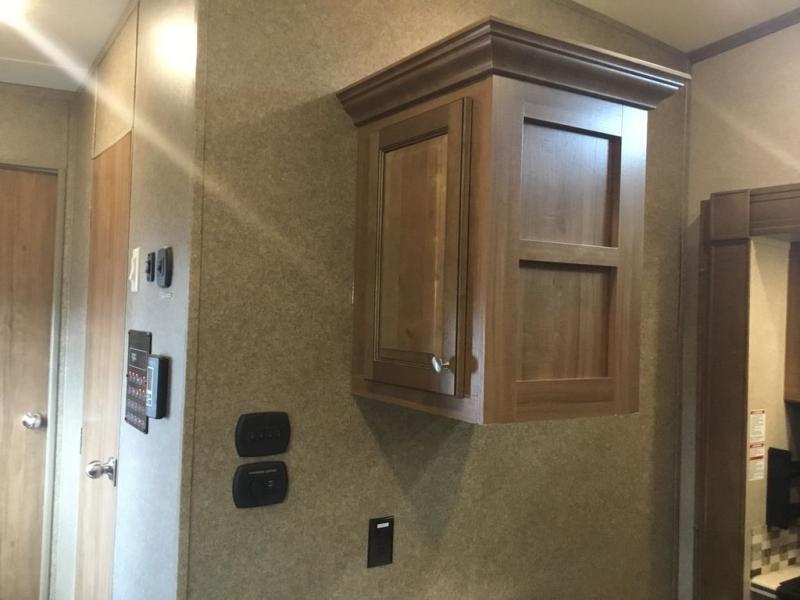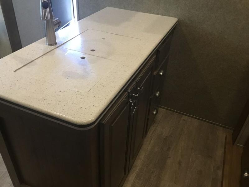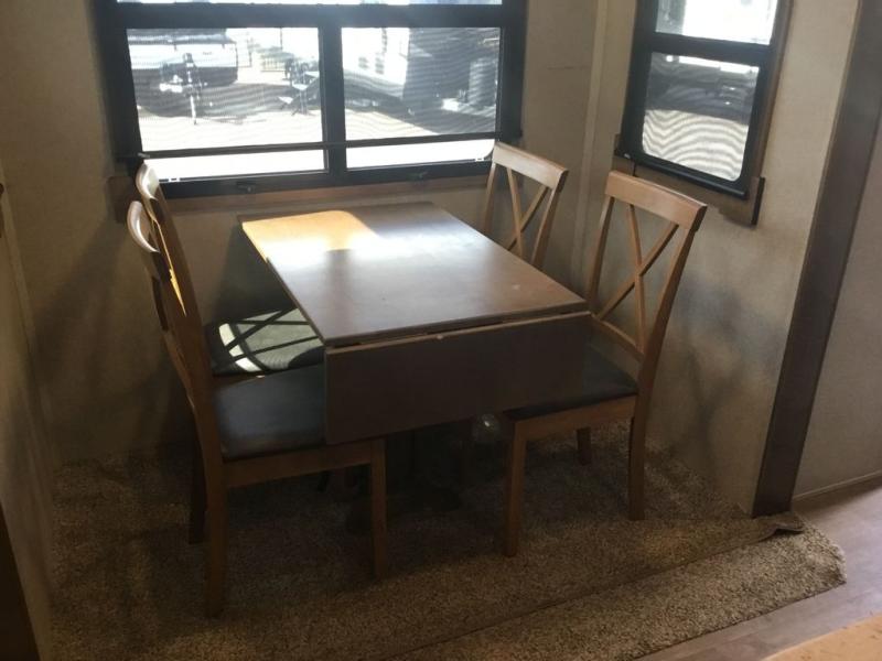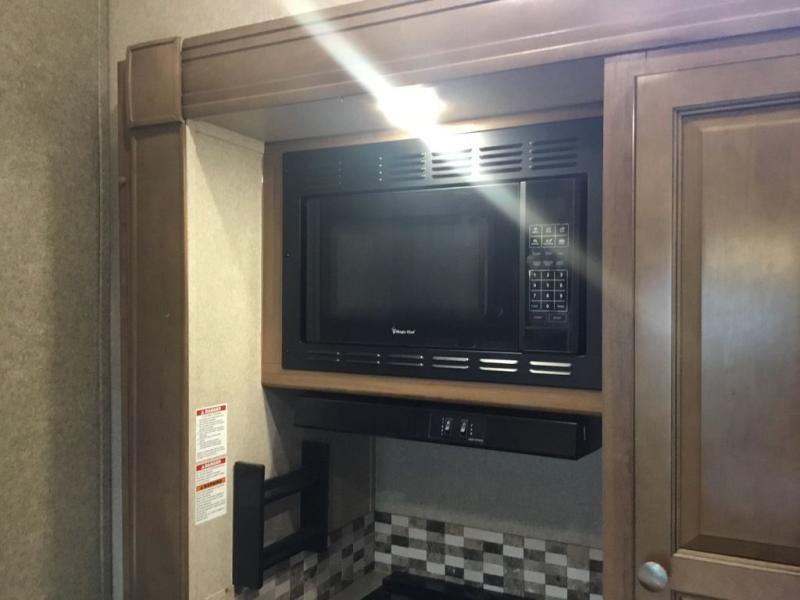 See just how easy and fun camping can be with this fifth wheel with four slide outs. Straight in from the door is the bathroom where you can easily get ready for your day. The rear bedroom is a spot where you can find comfort and rest. Here, you'll find a Serta queen bed, a large wardrobe, and you can add an optional TV. The kitchen area features dual opposing slide outs and plenty of room to move about while you fix your meals, plus a counter peninsula. In the evening plan to retreat to the front living area where you can watch your favorite movie or show at the large entertainment center, plus there is a fireplace which is nice for those chilly evenings. Within the roadside slide out there is a 60" hide-a-bed sofa where your kids or guests can sleep at night. This fifth wheel also includes a mini outside kitchen the chef of the family will love!