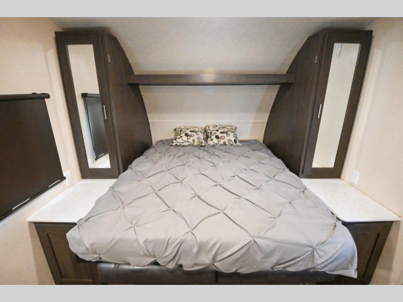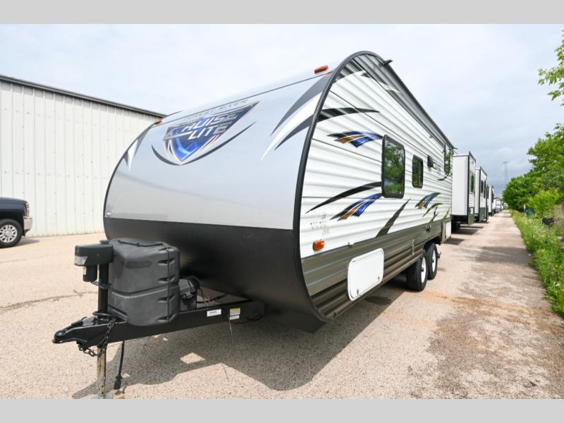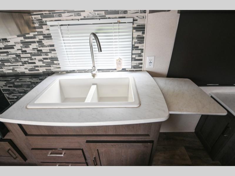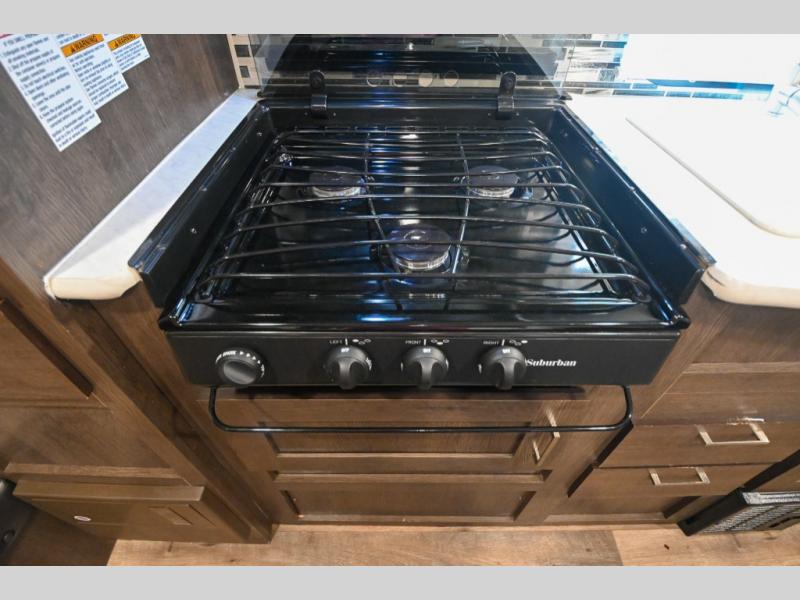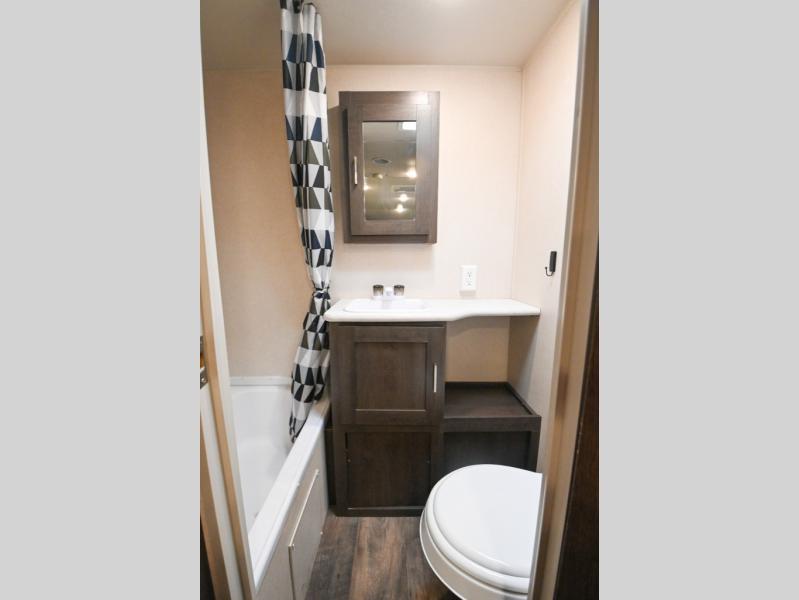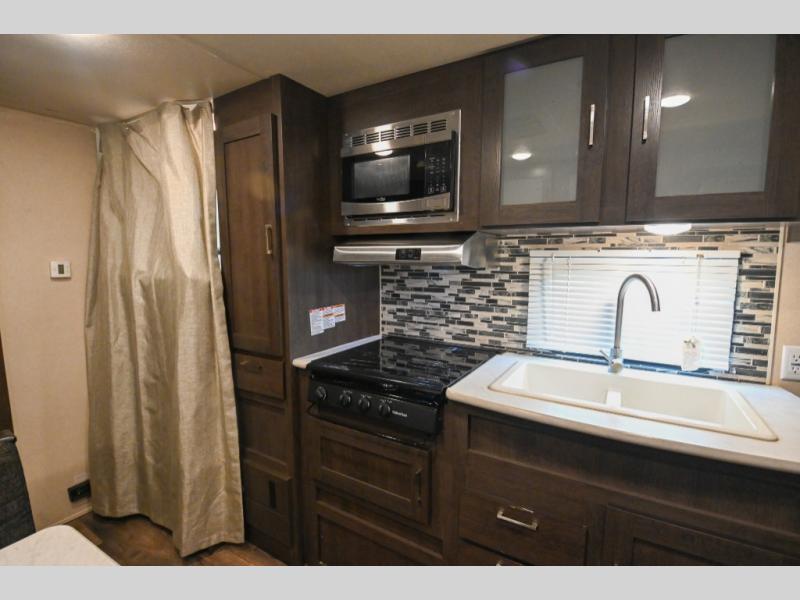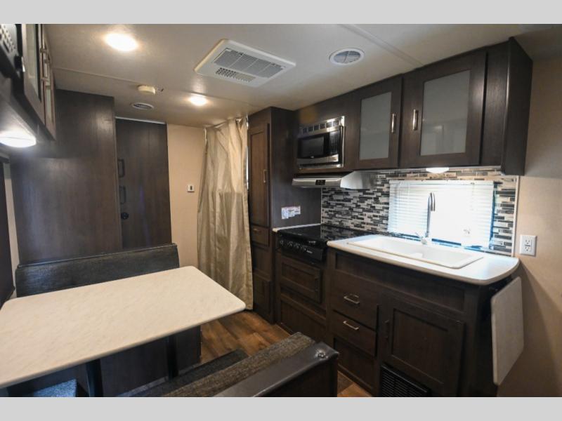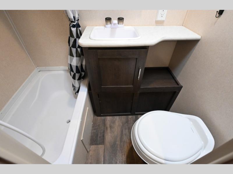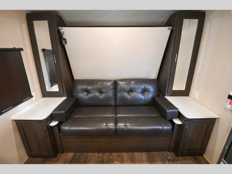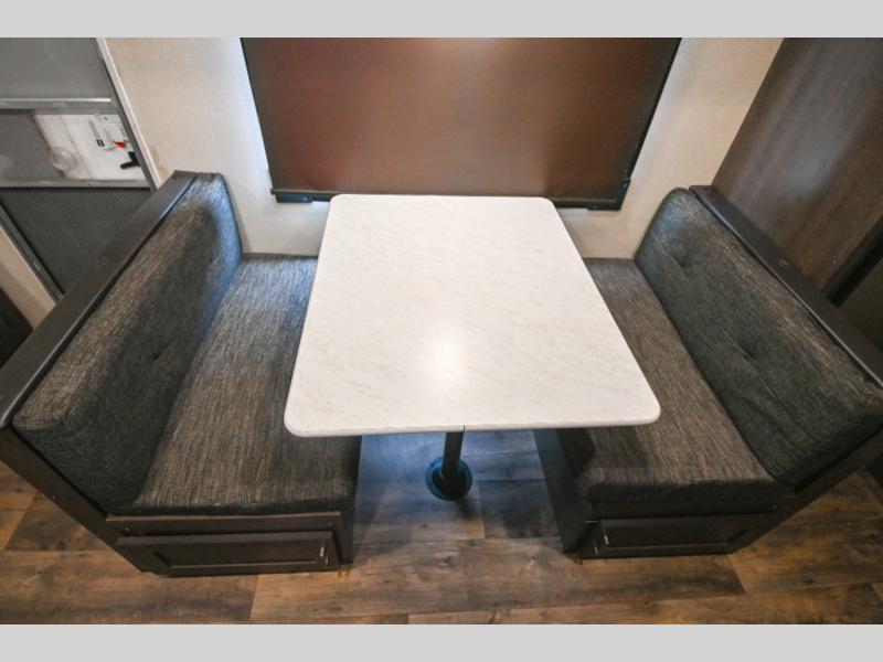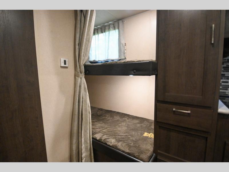 This unit is perfect for first time RV'ers or seasoned campers. The bunk beds will be great for the kids and you'll enjoy a space saving Murphy bed at the front of the unit. You can easily cook up a meal on the three burner cooktop and enjoy it at the booth dinette. The rear corner bath includes a shower/tub which makes bath time for the little ones easier than ever. This travel trailer also features a 14' awning and a pass through storage for all your large camping gear!