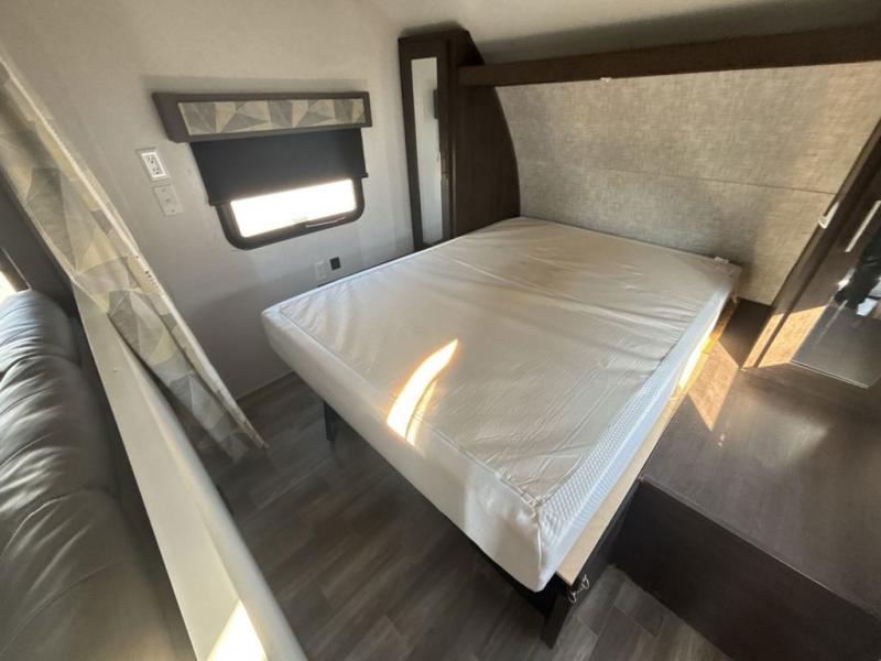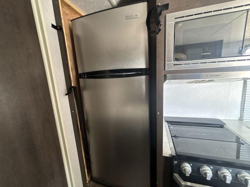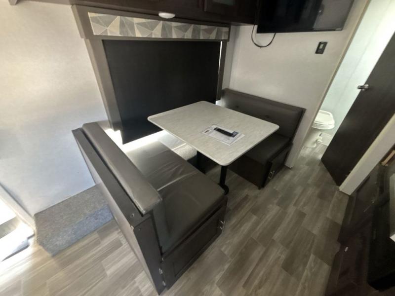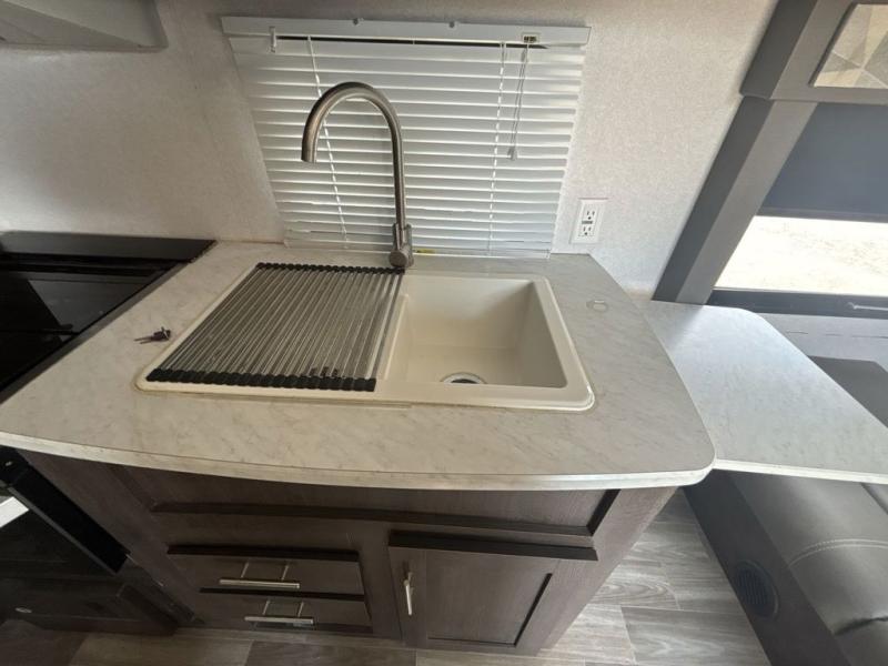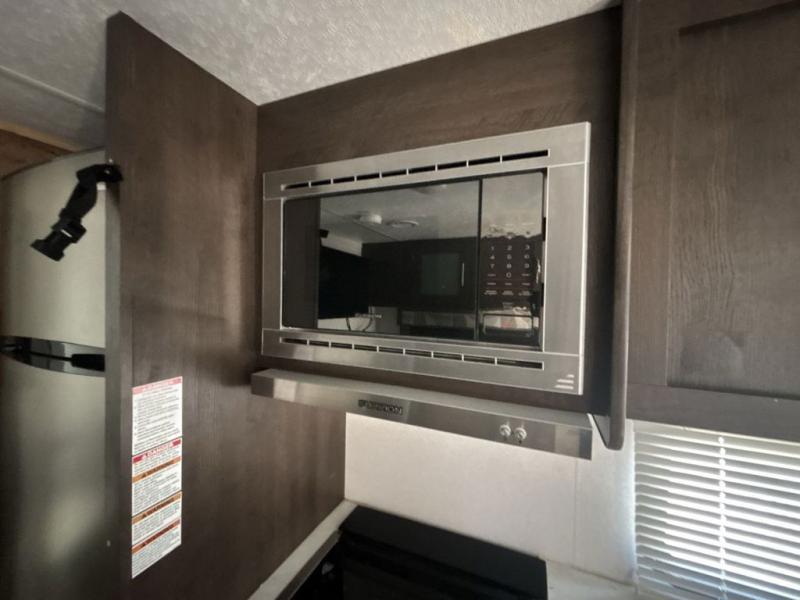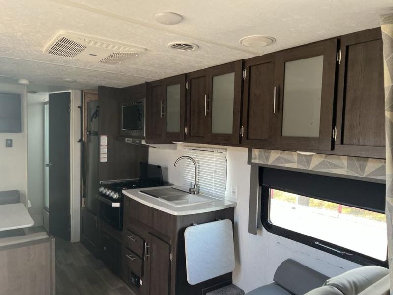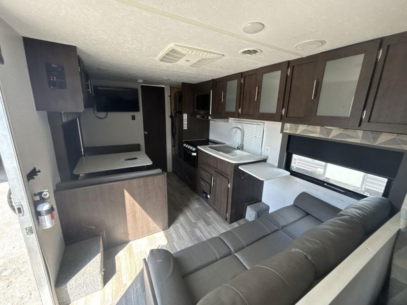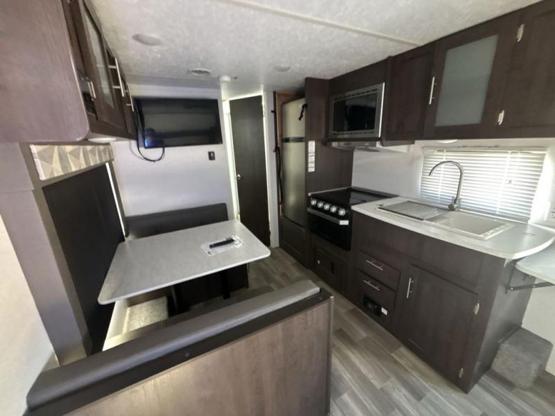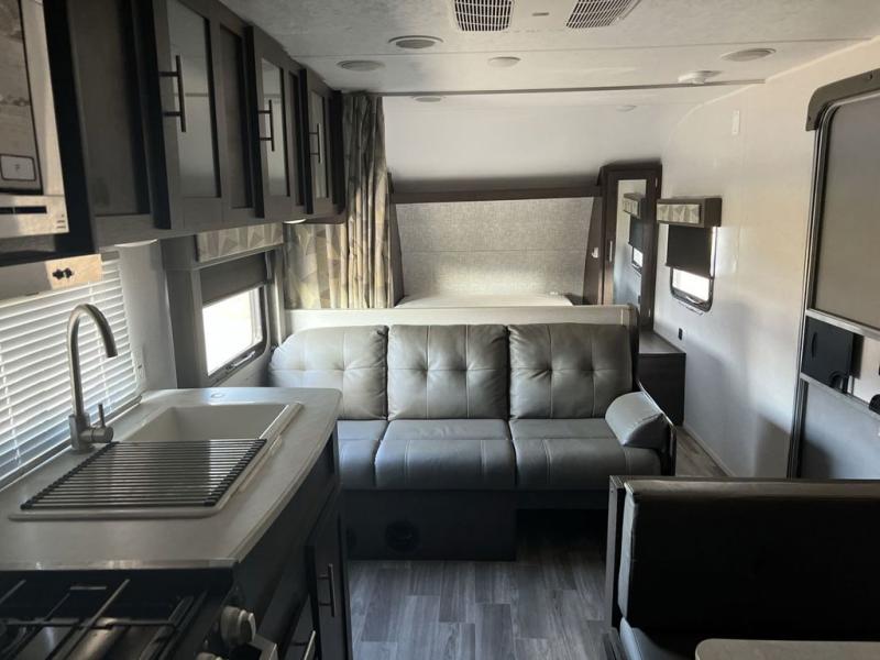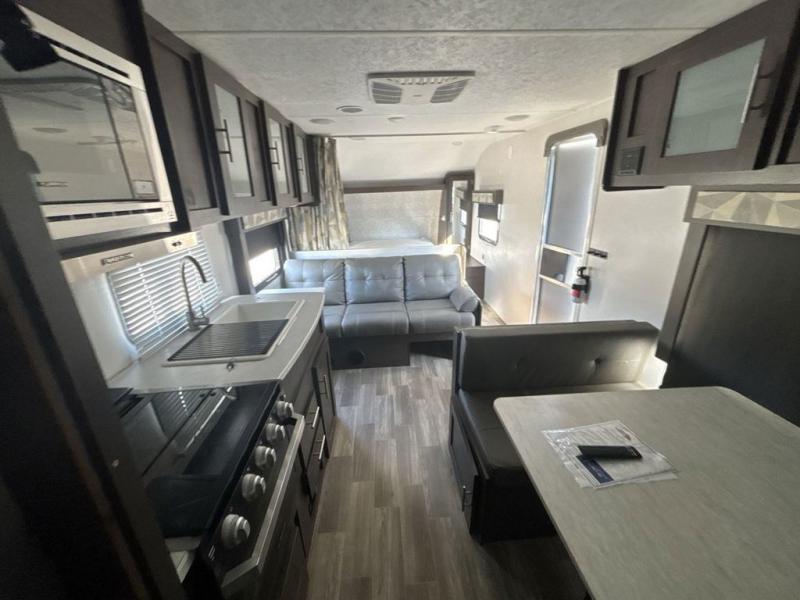 Pack the coolers and load up the family for a fun weekend camping trip in this travel trailer. Once you set up camp, you can prepare a quick lunch on the three burner cooktop or make a quick meal in the microwave. The sofa and booth dinette will provide seating space as well as additional sleeping space. There is a front queen bed that is behind the sofa and a wall, giving you a little more privacy. Clean up in the full rear bath after a long day of hiking and you can store your gear in the pass through storage!