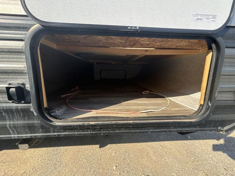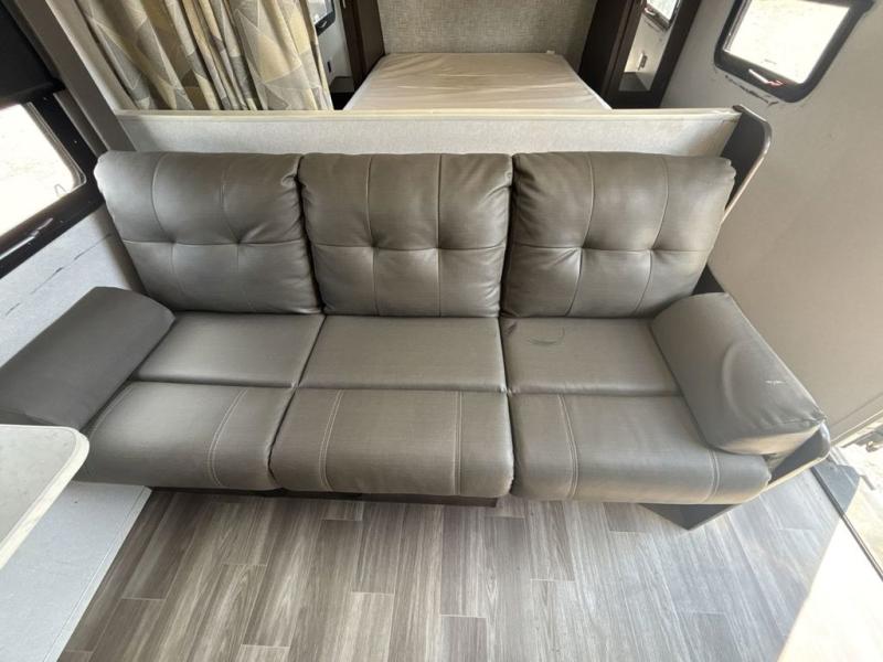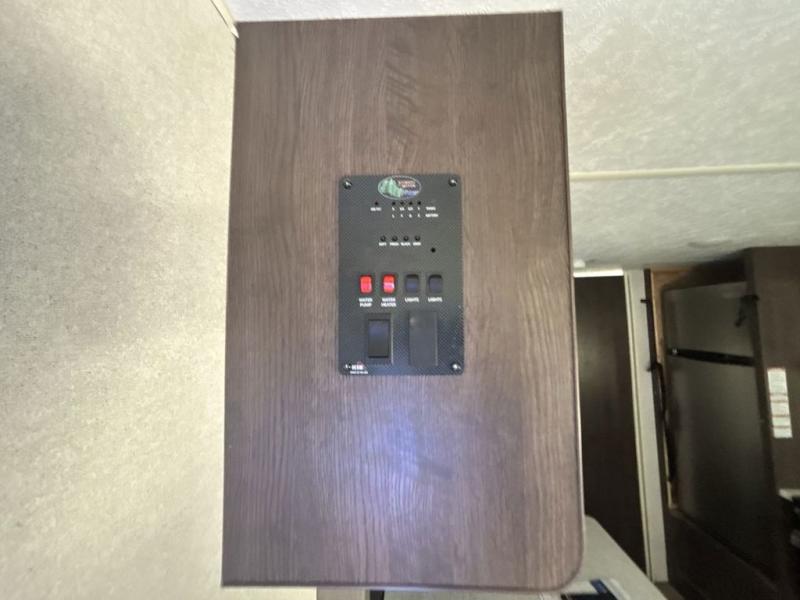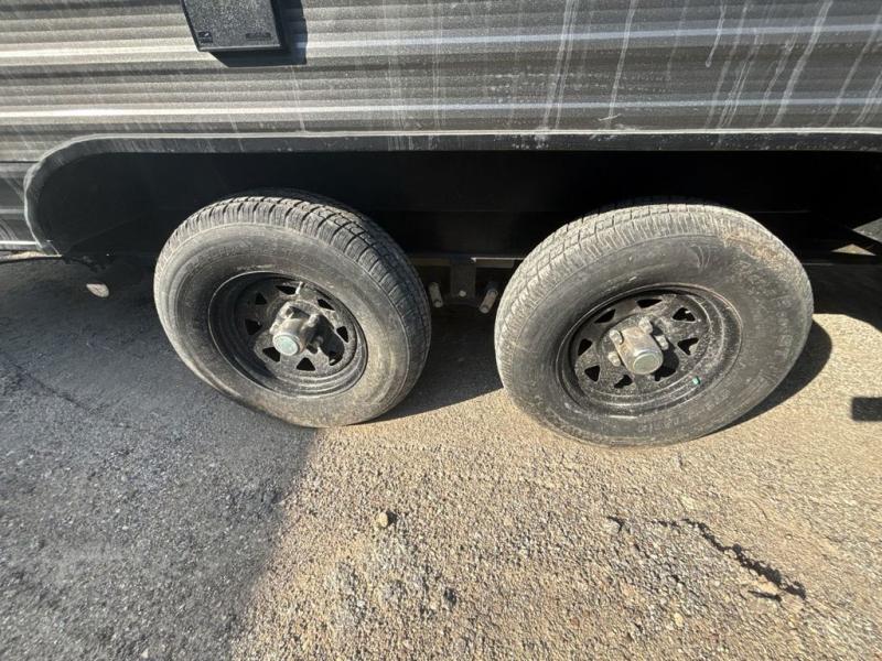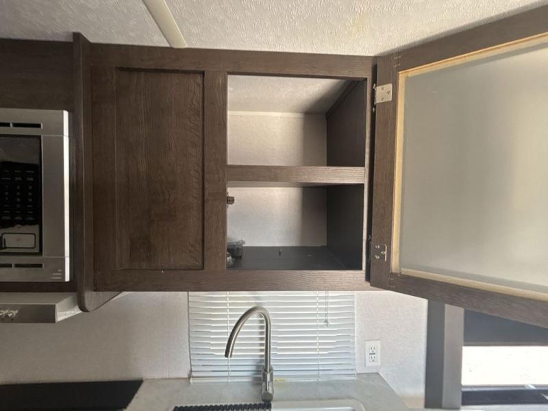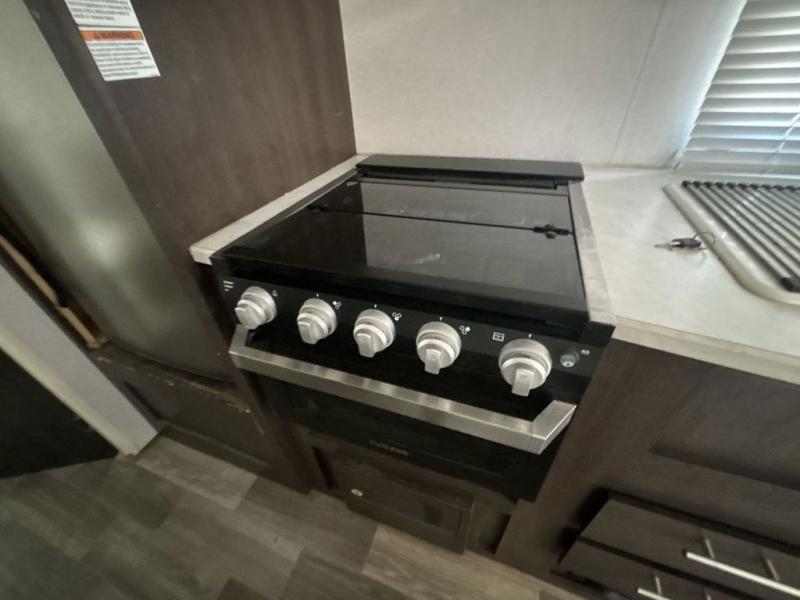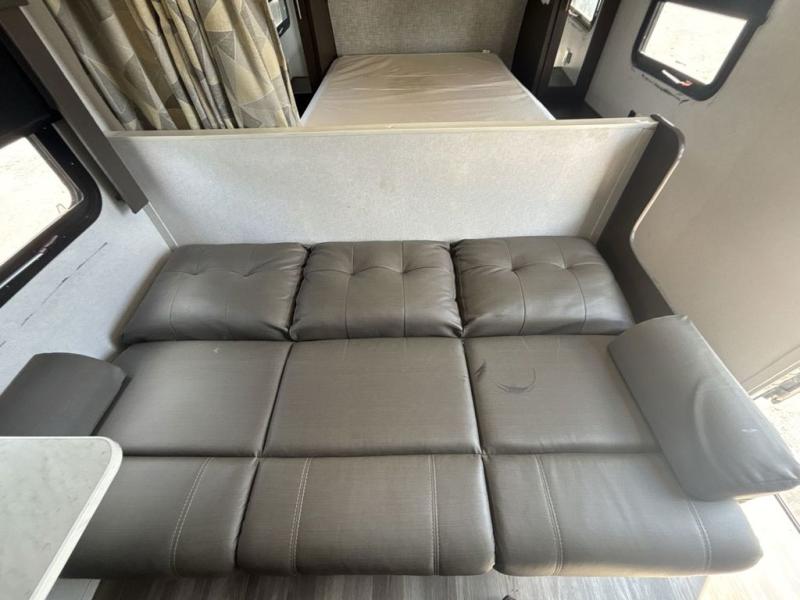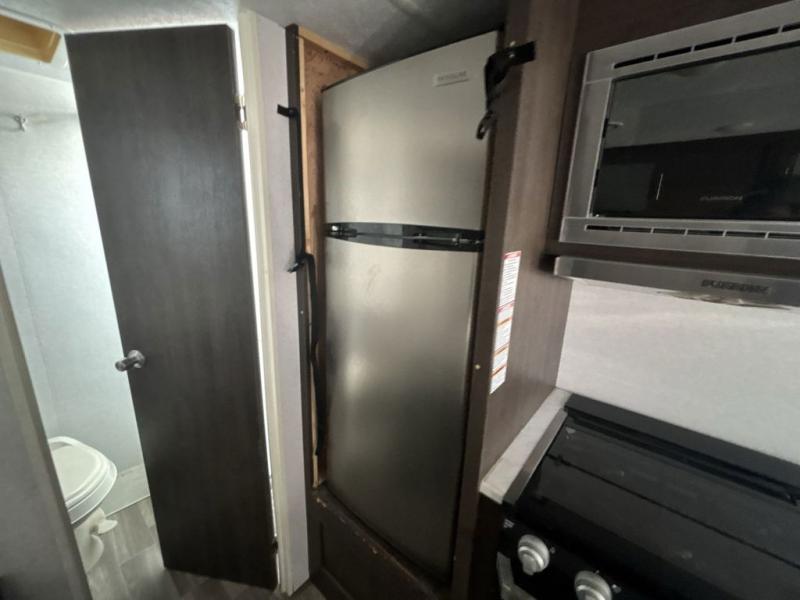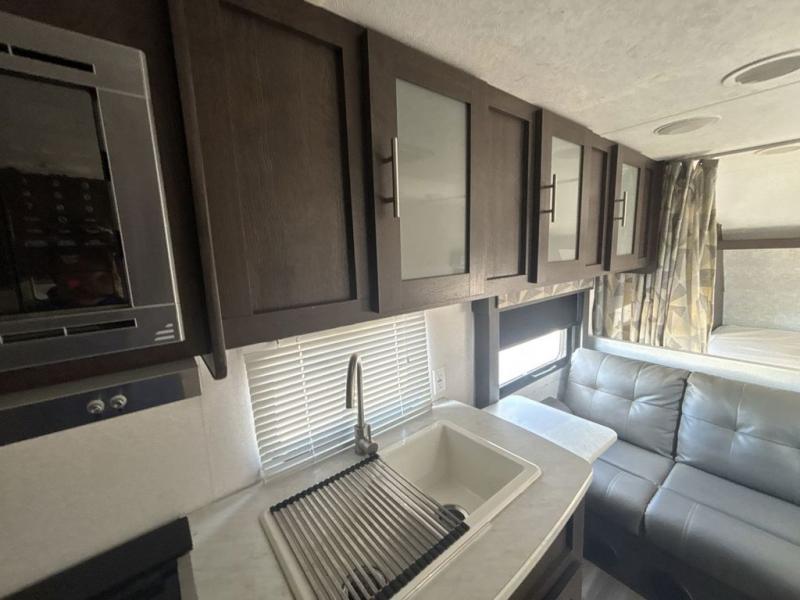 Pack the coolers and load up the family for a fun weekend camping trip in this travel trailer. Once you set up camp, you can prepare a quick lunch on the three burner cooktop or make a quick meal in the microwave. The sofa and booth dinette will provide seating space as well as additional sleeping space. There is a front queen bed that is behind the sofa and a wall, giving you a little more privacy. Clean up in the full rear bath after a long day of hiking and you can store your gear in the pass through storage!