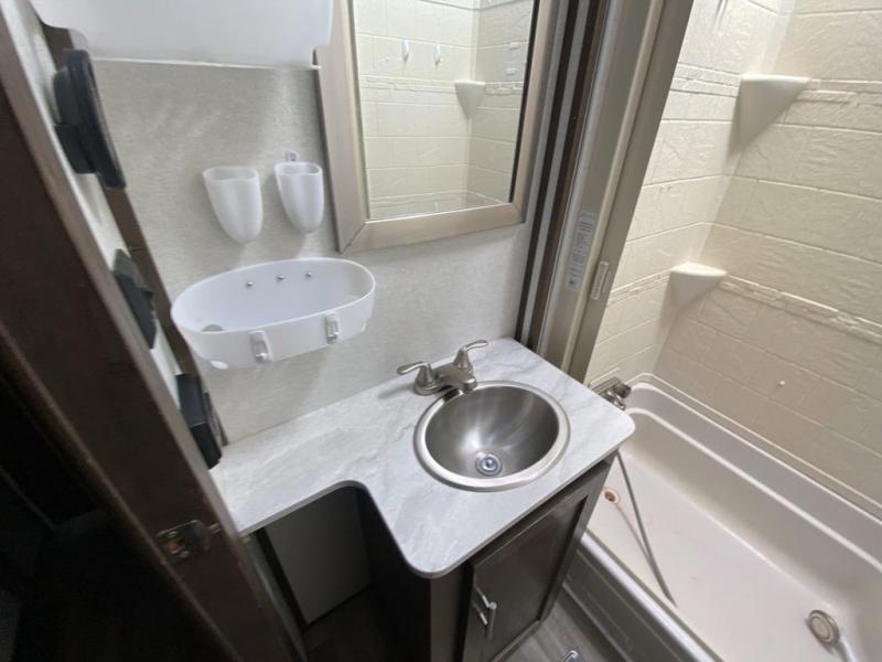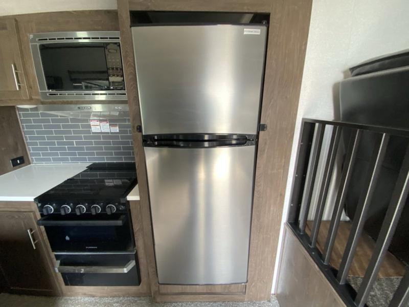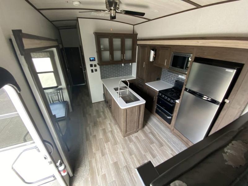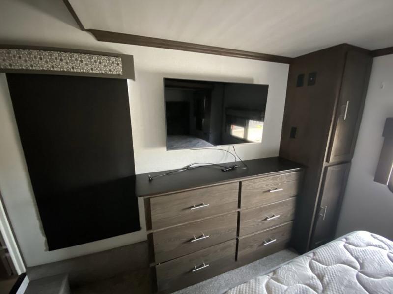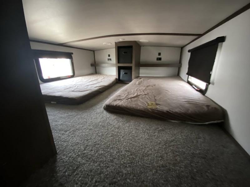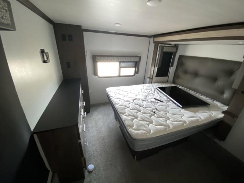 When you and your family are ready to answer the call of camping do so with this Salem Hemisphere GLX. This model is anything but ordinary from the five slide outs to the front separate living area there is plenty of space to spread out and enjoy your time away. Enter near the front into the kitchen, or near the rear across from the full bathroom and loft stairs. Your kids will surely love their own space in the loft with bunk mats and storage for their things. Meal prep is easy with this kitchen island and the appliances, plus you can eat your meals at the free standing dinette. In the evening, you will find yourself being drawn to the fireplace on those chilly evenings, and you can watch TV with plenty of seating choices. The living area even provides more sleeping space. This is the RV for fun and entertainment where ever you decide to setup!