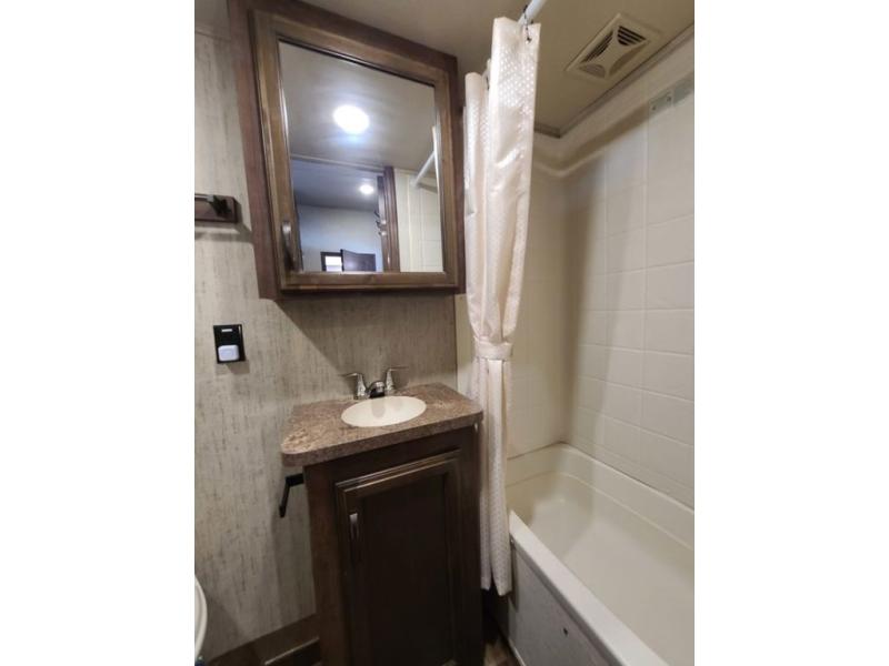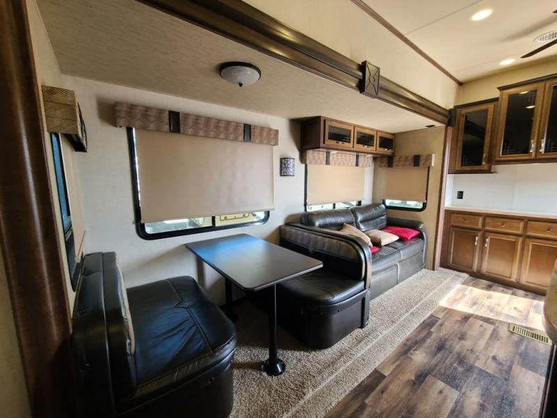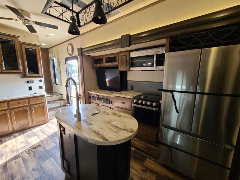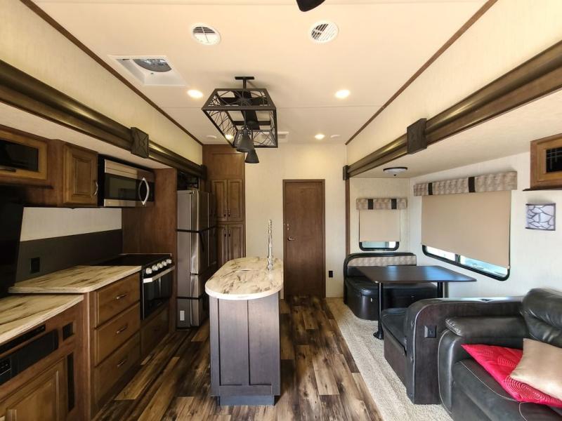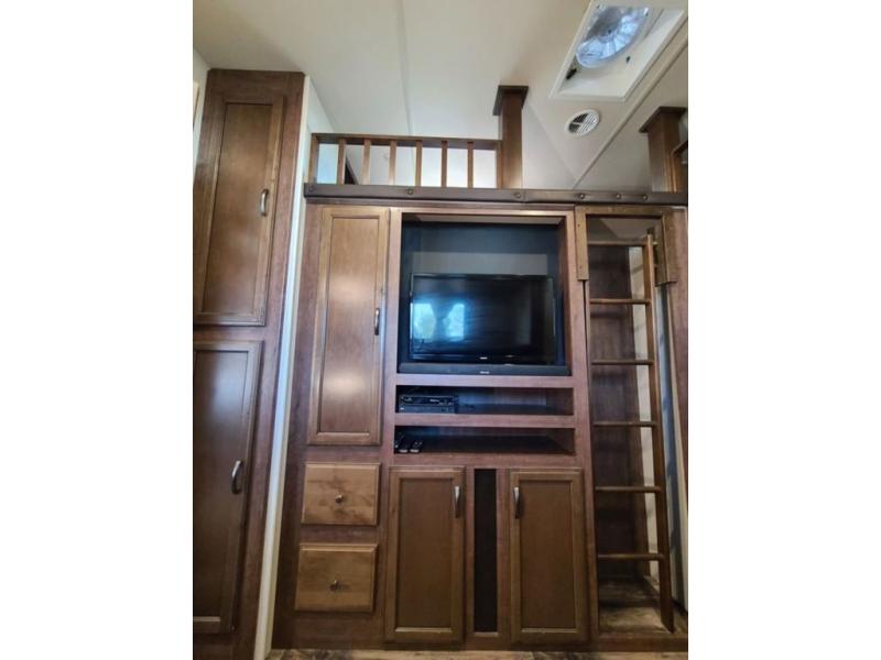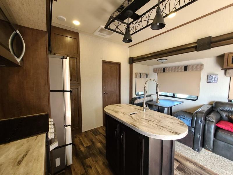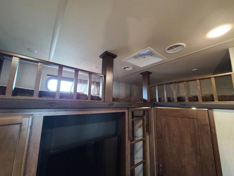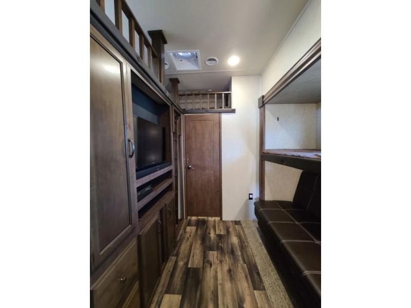 For the ultimate family-friendly fifth wheel, you will want this four-slide Sandpiper fifth wheel. With two entry doors, you can easily access the inside of this model from the rear or the front. Your kids will enjoy their own space with the bunkhouse suite that has its very own full bathroom, as well as a loft above. Outside you can enjoy the shade from the 15' electric awning with LED lights and the convenience of the exterior kitchen with a bumper-mount swivel gas grill.