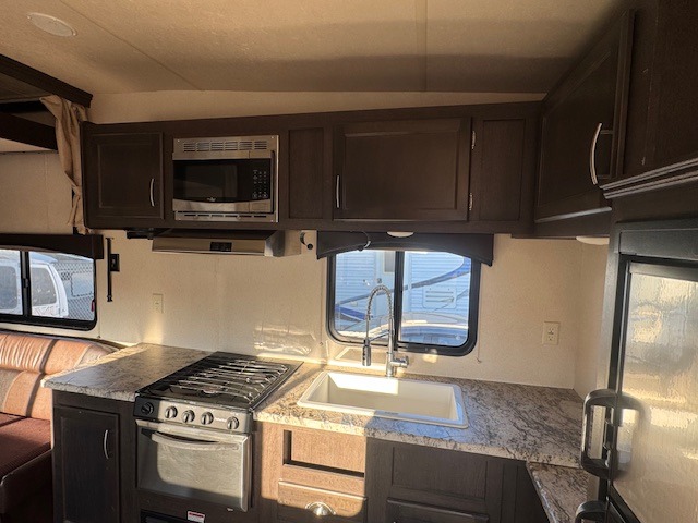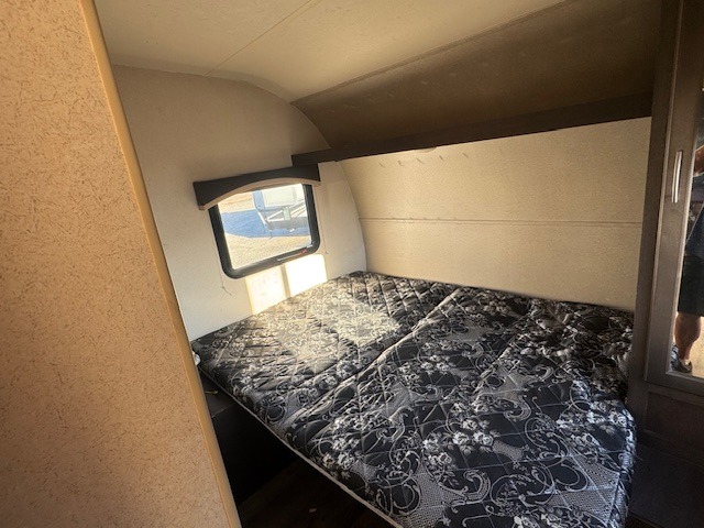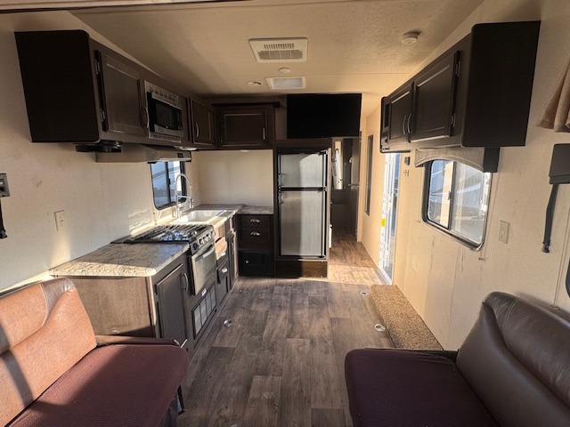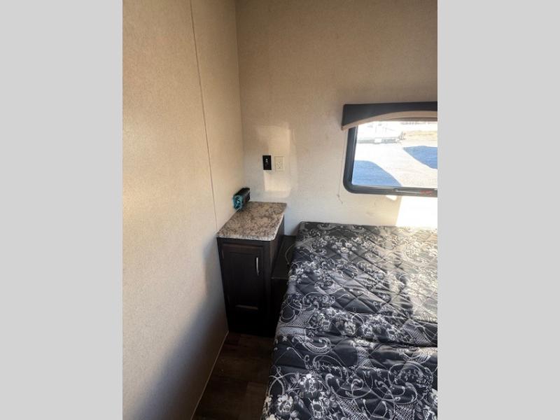 Whether you have been camping for years, or this is a new adventure for you, let this travel trailer take you, your family, and a few off-road toys away to the outdoor playground of your choice. It features a front bedroom with an RV queen bed, a nightstand, and clothing storage so that you can sleep and get dressed in privacy. The pass-through storage is the perfect place for you to easily store and access all of your outdoor camping equipment. You can comfortably enjoy your meals at the dual opposing flip sofas with tables or transform them into an extra sleeping space at night. You might even choose a few options such as adding an electric bed for more sleeping space, and optional chairs with a table in place of a sofa. Take a look today!