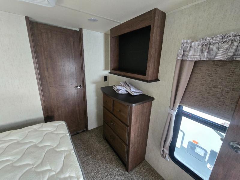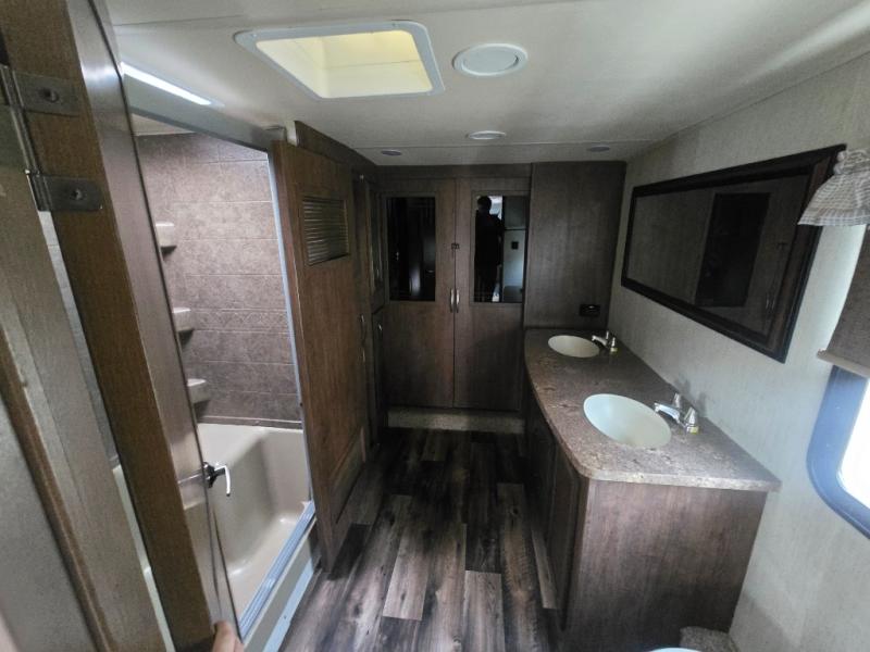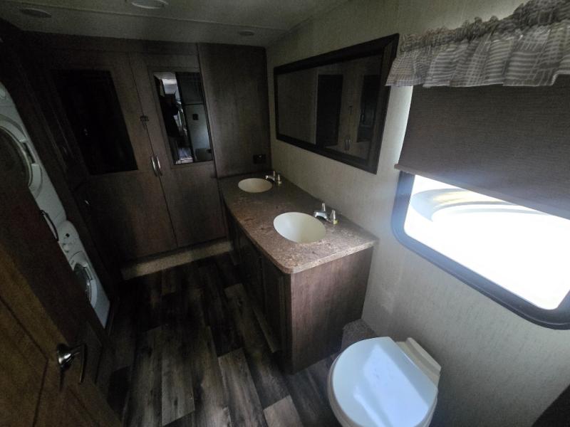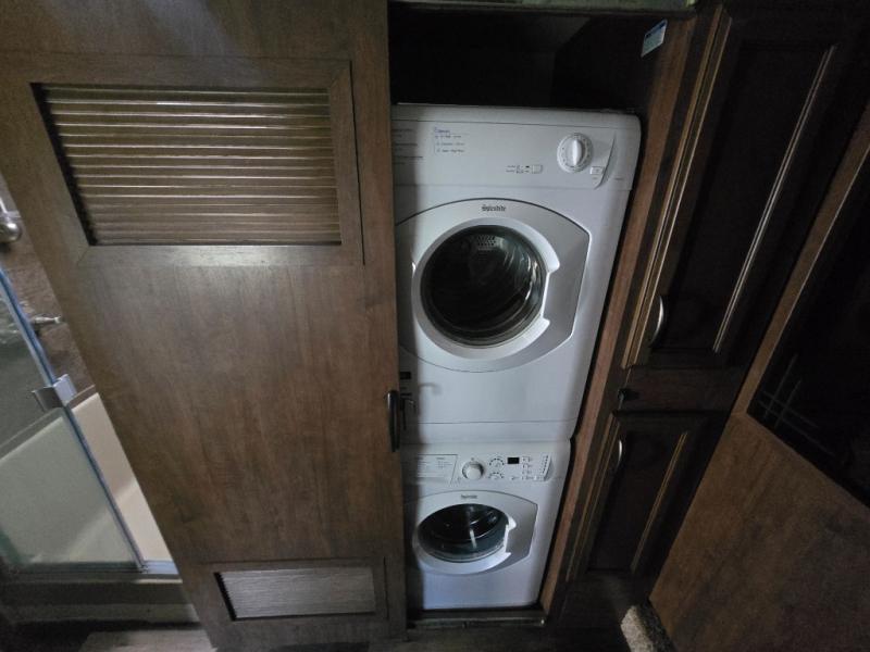 Looking for a master suite including a large bathroom with dual sinks, a shower with a seat, and a full wall wardrobe for all your clothing? This might just be the one! As you walk-through the master bedroom you will appreciate the floor space provided by the slide out queen bed. The front bathroom even offers a space for a washer and dryer if you choose that option. There is a half bath off of the kitchen for quick breaks, and to be utilized by your RVing friends. You can cook inside with full amenities including a kitchen island, or outside on the exterior kitchen while watching the drop-down TV and grilling steaks. There is so much more to love, step inside!