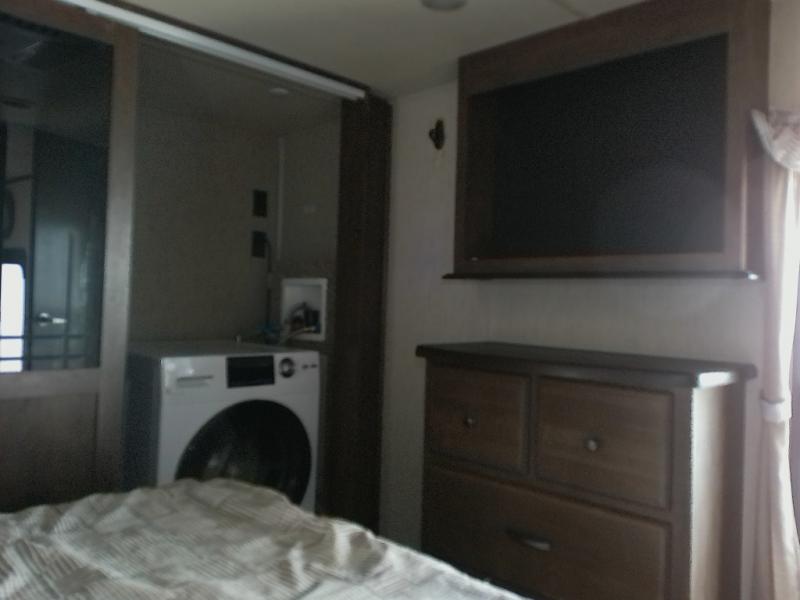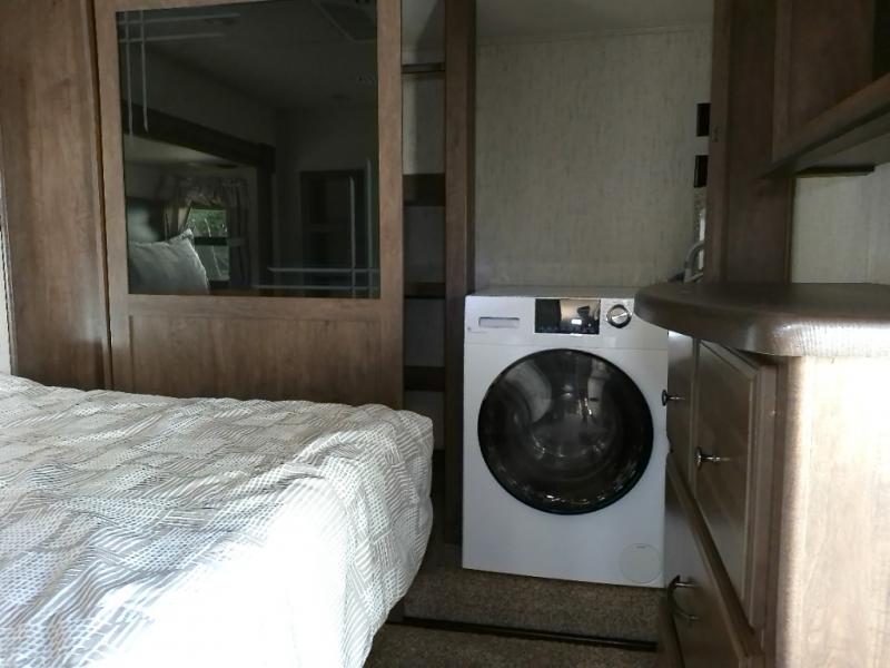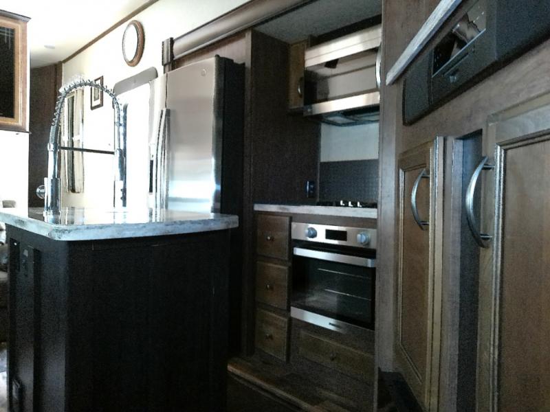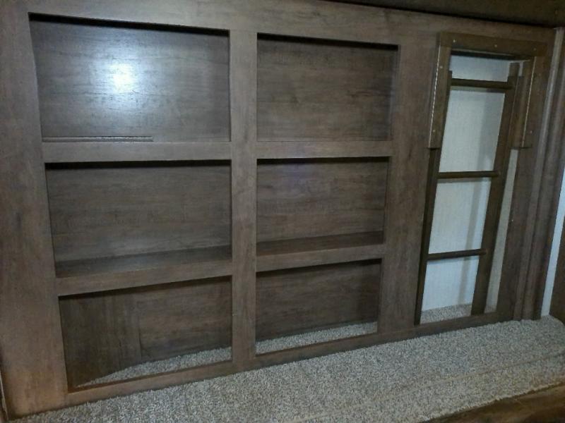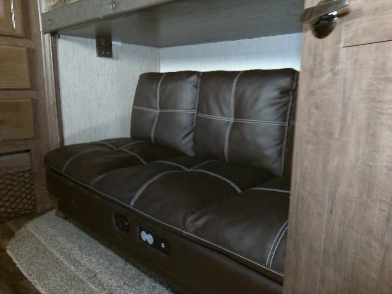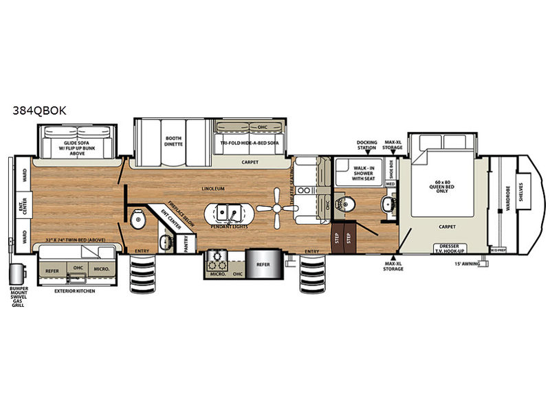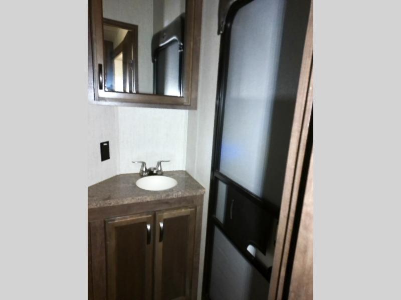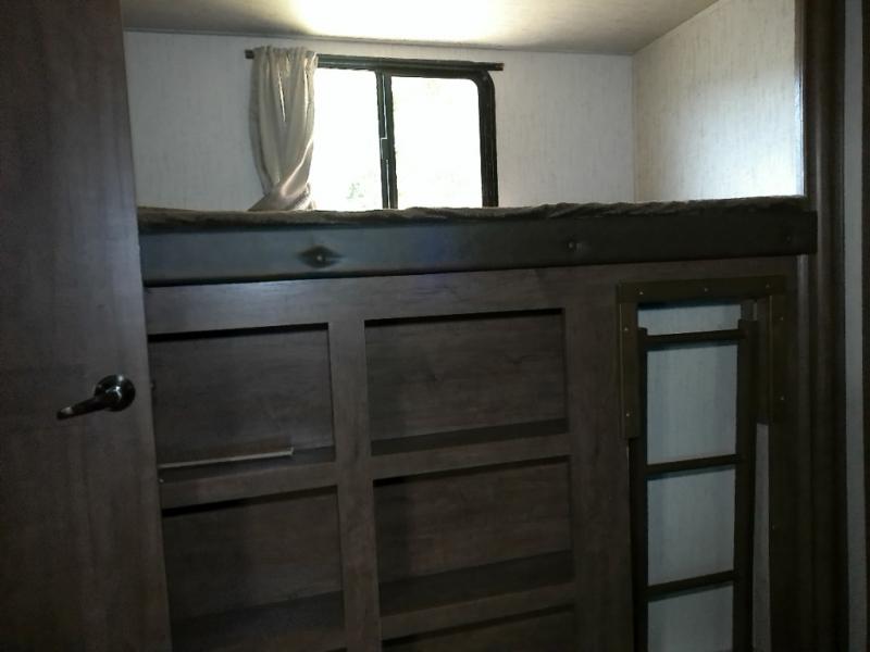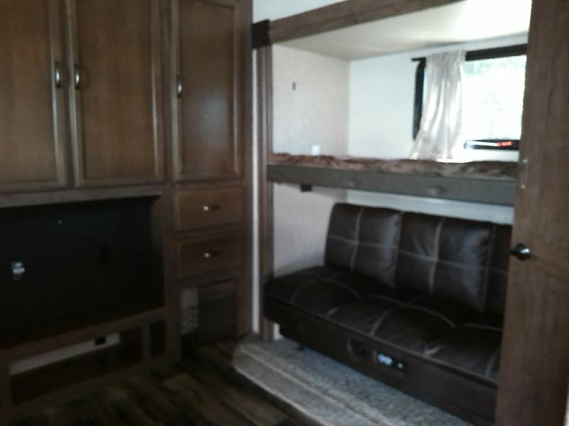 Just imagine having two entries into this fifth wheel to quickly get to the half bath or the main area depending on your needs. Now imagine the kids having their own room to hang out in on rainy days with a half bath attached. In the kitchen/living area you will have plenty of seating including theater seats. You will also find an exterior kitchen as well as a full kitchen inside, five slide outs offering lots of interior floor space to move about freely, and a master bedroom to recharge for the next adventure.
