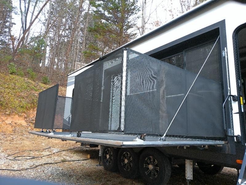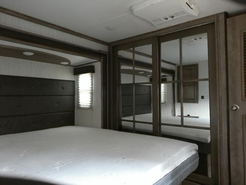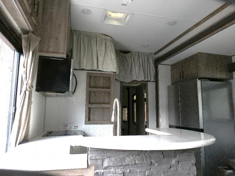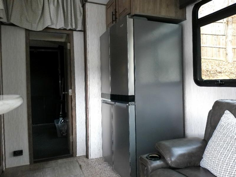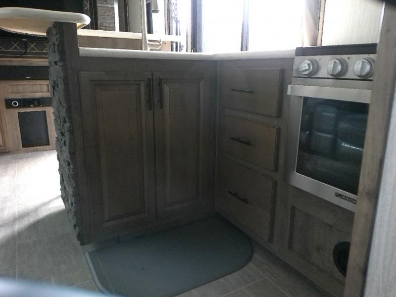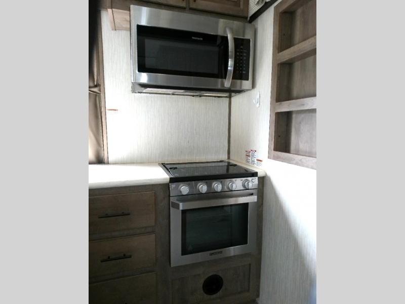 The fun doesn't have to stop out on the trails with this Vengeance Touring Edition toy hauler. You can easily continue the party once back at camp. There is a convenient half bath off the garage area which features 12' of space along the roadside and 10' 10" along the curbside, and there is also a full bath up front. Grab some refreshments and snacks and head out onto the side raised patio deck to enjoy. If the weather is a bit chilly, take the party inside where you have a large entertainment center with theater seating for four, plus bar stools at the counter and a mini fridge. You can also hang out in the garage area where there are dual flip sofas beneath the electric bunk, as well as a TV at the head of the garage space to enjoy.