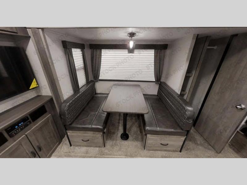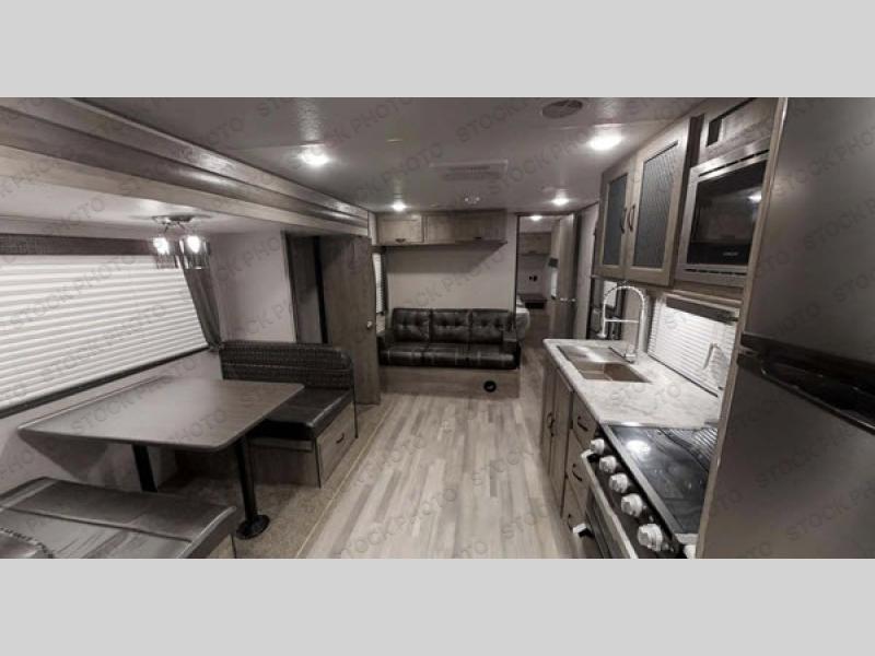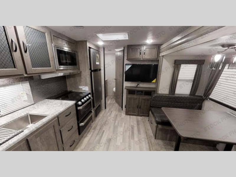 For a truly fun and relaxing camping trip, your family of six will love this travel trailer. You'll find comfortable sleeping space on the front queen bed, the jiffy sofa, or the little ones can fit on the folded down dinette. This unit features a kitchen skylight, giving you natural light as you cook a meal with the three burner cooktop, and clean up is a breeze with a large trash can in a designated out of the way area. For added interior space, this model includes a slide out with an oversized panoramic window for a beautiful outside view. Everyone will appreciate the rear bath that includes a shower skylight!