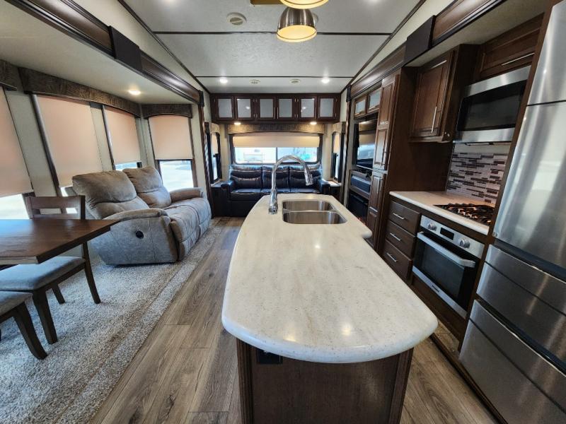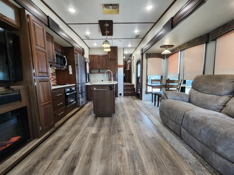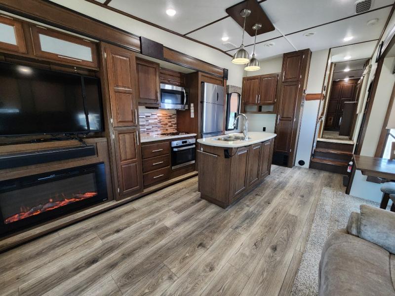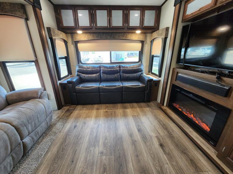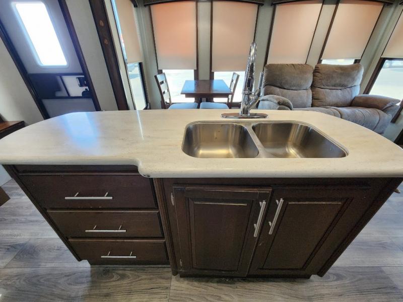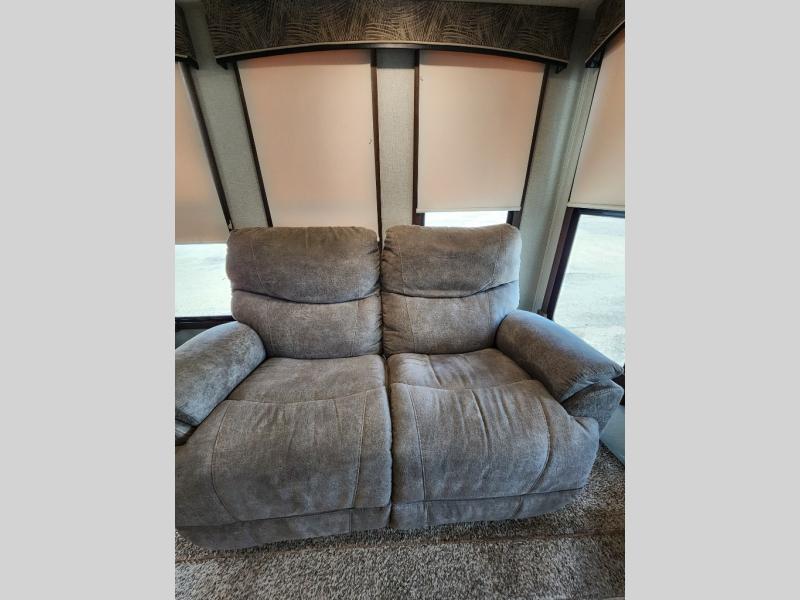When you travel in this Wildcat Wide Body fifth wheel, you won't even be able to tell that you've left your own home. The wide body of this model, along with the three slides that have been included, make an open-concept living area possible. While you are lounging on the dual swivel recliners and enjoying the aromatic smells of dinner being prepared on the kitchen island, you can watch your favorite shows on the 50" LED HDTV.