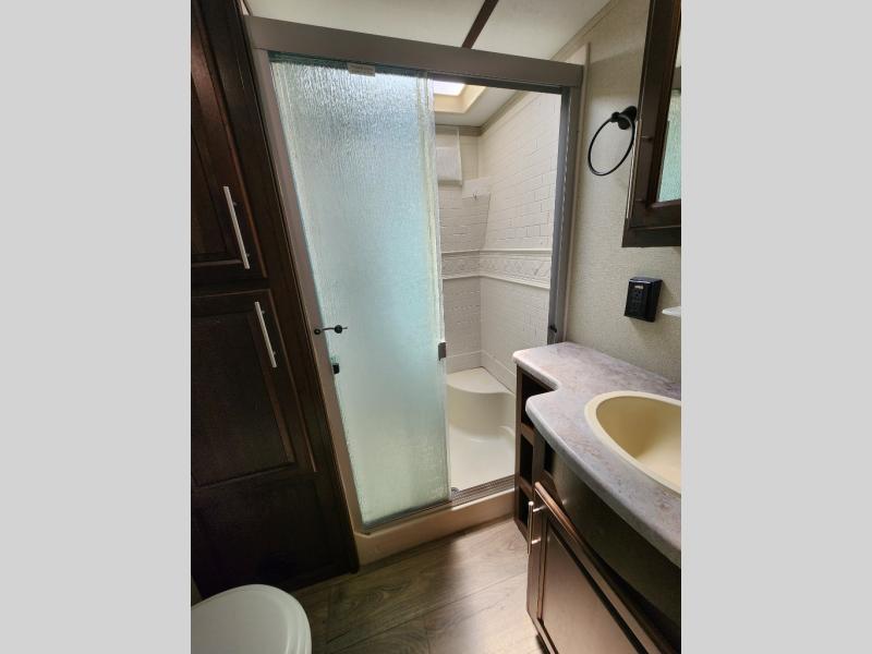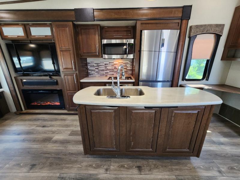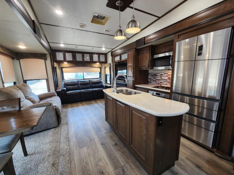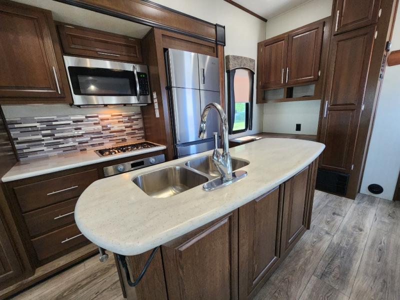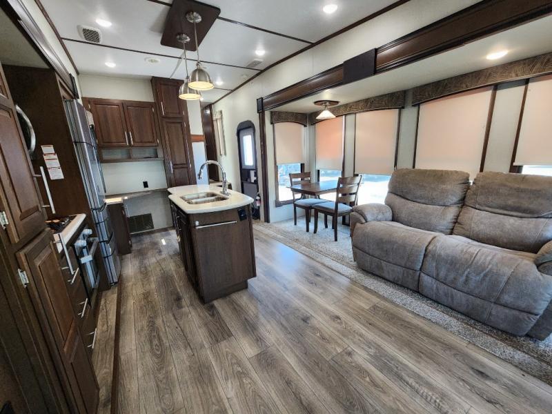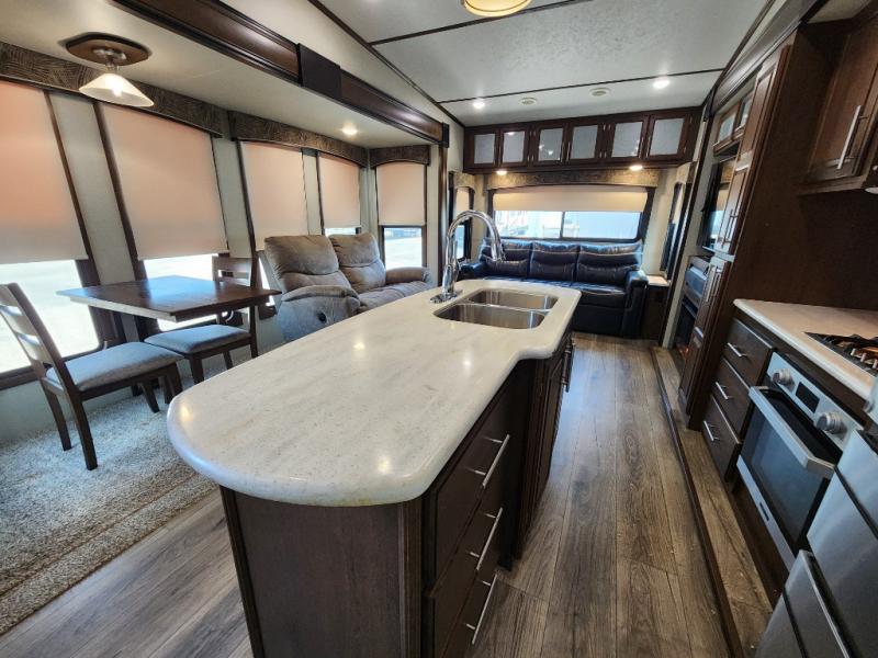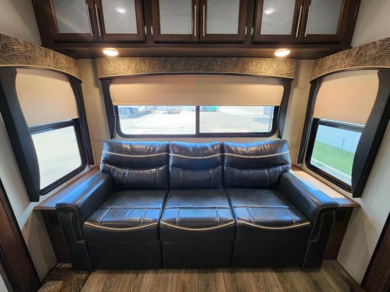 When you travel in this Wildcat Wide Body fifth wheel, you won't even be able to tell that you've left your own home. The wide body of this model, along with the three slides that have been included, make an open-concept living area possible. While you are lounging on the dual swivel recliners and enjoying the aromatic smells of dinner being prepared on the kitchen island, you can watch your favorite shows on the 50" LED HDTV.