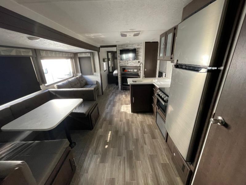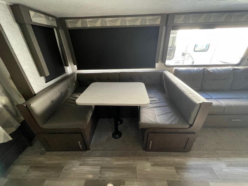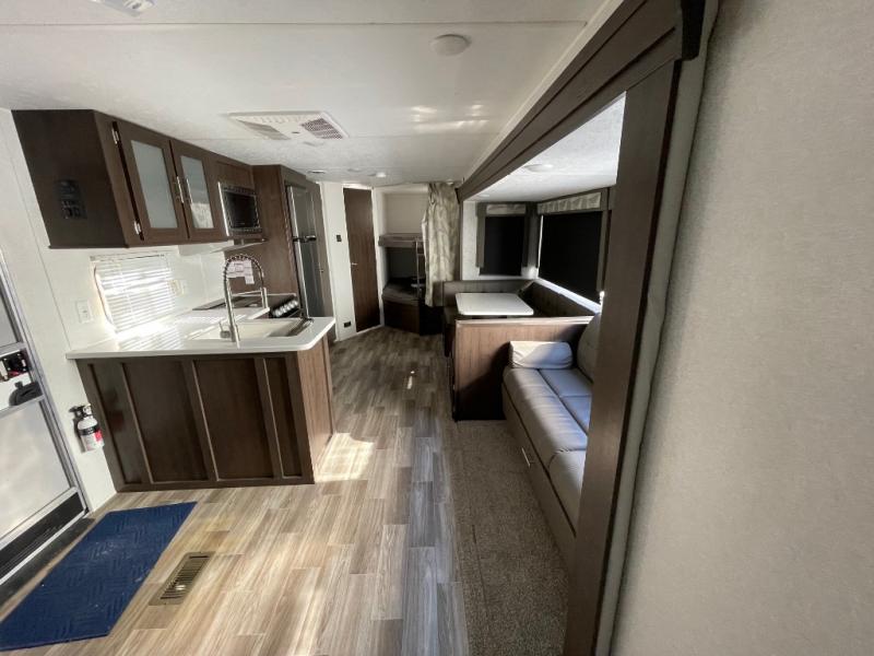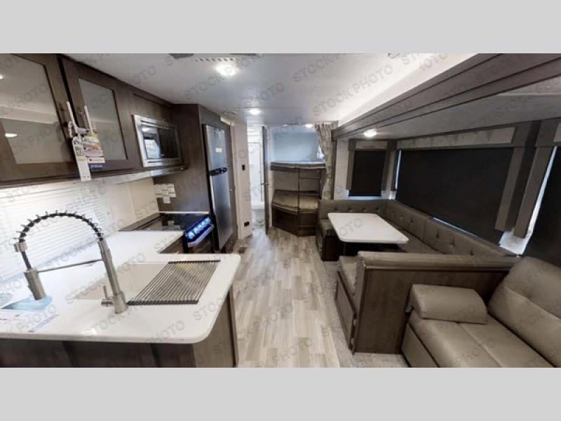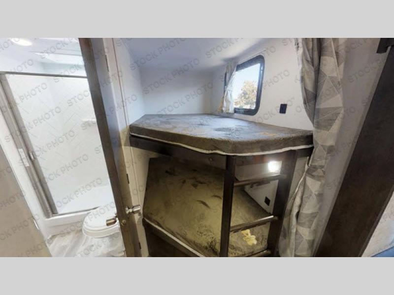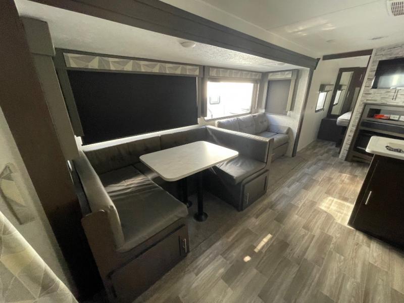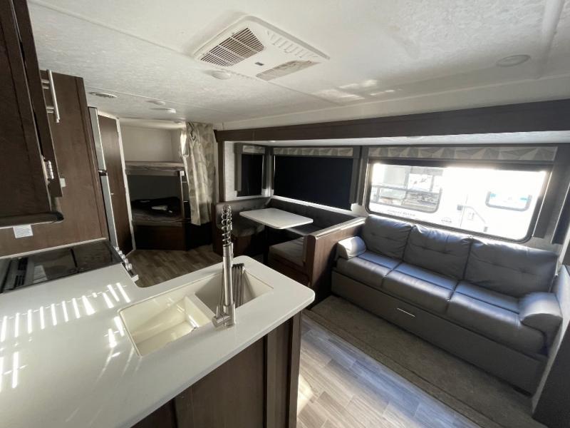 Grab the kids and a few of their friends for a weekend get-a-way! There is plenty of room for everyone inside with a large slide out u-shaped dinette and sofa, plus dual entry doors make it easy for everyone to go in and out when loading and just normal daily use. You will especially love the quick access from outside into the full rear corner bath. Dual pantry storage inside allows you to stock up on goodies for the kids and their friends, and a large outside pass-through compartment keeps all of the outdoor gear and yard games neat and organized when not in use. At night, you can relax and enjoy the camp atmosphere with a fire and s'mores and an 18' awning to kick back under even after dark. When you head inside for the night, there is plenty of sleeping for everyone with double bed bunks in the back for the kids, and a private bedroom with queen bed up front for you and your spouse. You can even use the u-shaped dinette and sofa if needed for extra overnight guests. Enjoy this full-featured unit with all the amenities you need and want to be comfortable for any outdoor adventure!