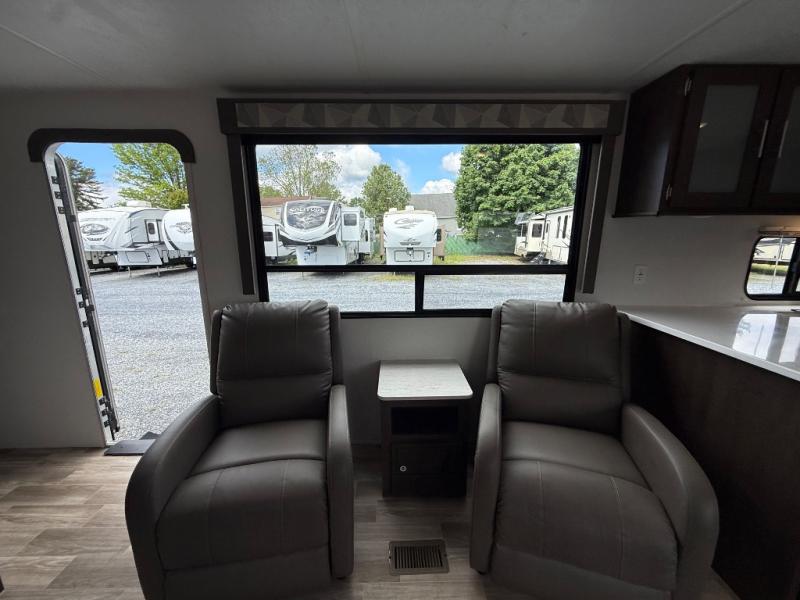 This single slide out travel trailer is perfect for your family of six looking for a new adventure. Mom will enjoy the rear kitchen that includes a pantry and a three burner range. The dinette within the slide out is perfect to enjoy meals at and when you're through, you can relax on the sofa. This unit also includes two recliners, so you'll feel right at home! You'll love the full bath in this unit, and the queen bed in the private bedroom is perfect for a good night's rest.