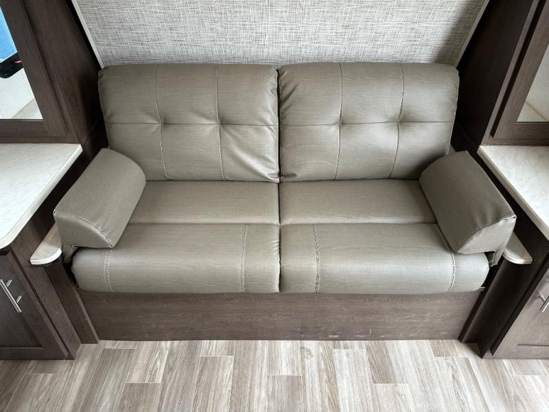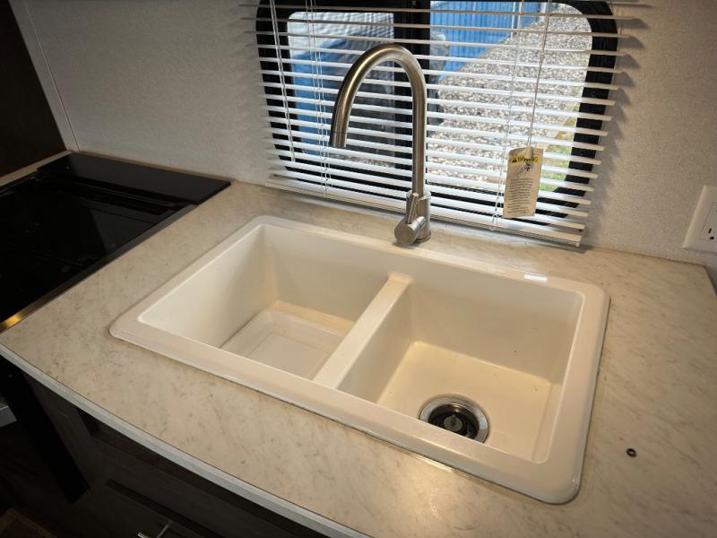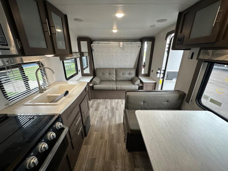 You will love the versatility that this Wildwood X-Lite model 19DBXL offers with a Murphy bed setup. You will have plenty of space and seating during the daytime hours between the sofa and booth dinette, even without any slide outs. Once it gets dark, and you are ready for bed, just drop down the Murphy bed and voila, a comfortable sleeping spot for the night! There is also a double bed in the back next to the private tub/shower and toilet. The dinette can even be transformed into sleeping for a little one or two if you need the extra room. You will find complete kitchen amenities indoors and also have the ability to cook outdoors using the standard camp kitchen which is great on beautiful days, and even with a light rain the 20' awning gives you protection from the elements and allows you to cook and hang outside the trailer if you like.
