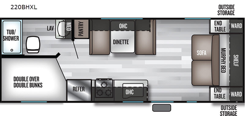 Round up the kids and head into this Forest River Wildwood X-Lite 220BHXL travel trailer. It features a rear set of double bunk beds that your kiddos are sure to love and you will love that they are located right next to the rear bathroom to help eliminate any late night accidents. You can easily whip up any of your best meals inside the kitchen with the three burner cooktop or you can even pop a bag of popcorn in the microwave, plus there is a 4.3 electric refrigerator for you to keep your perishables cold and fresh. Another convenient features is the Murphy bed, it can easily transform into a bed at night and a sofa during the day!