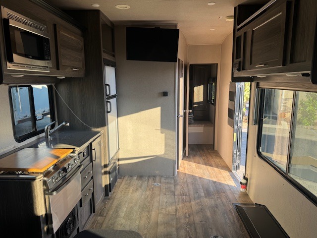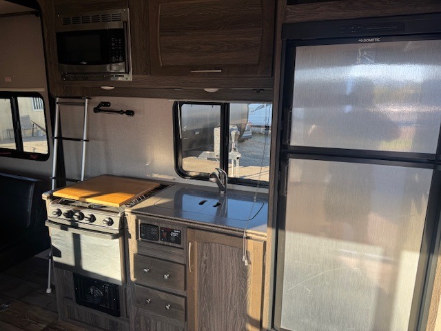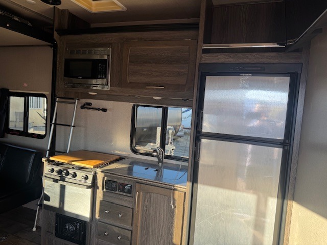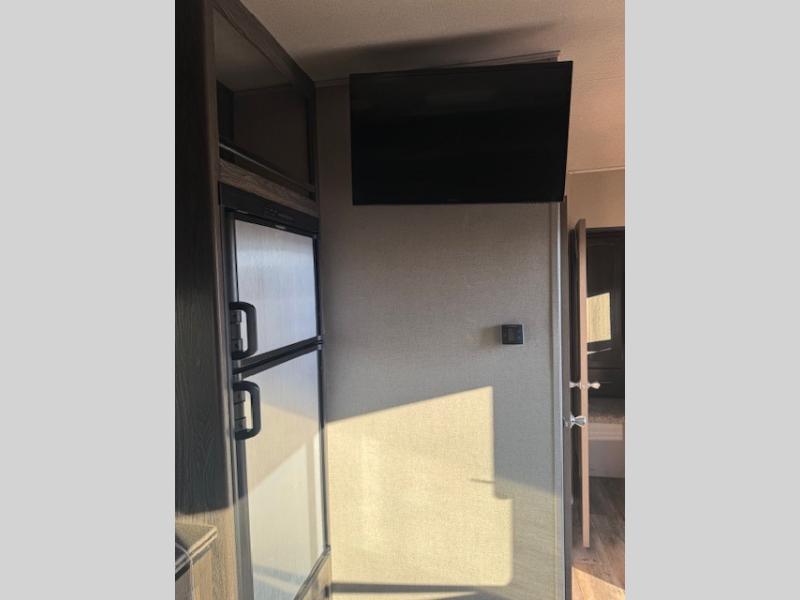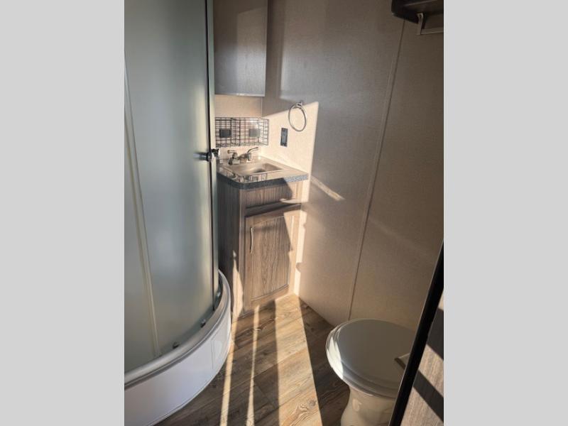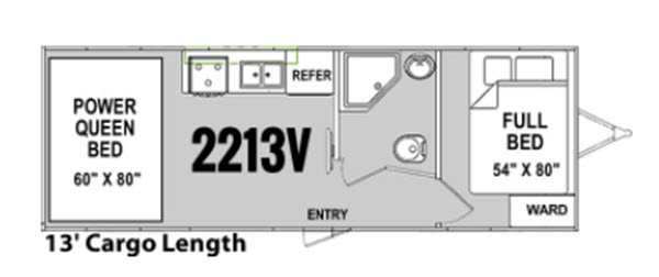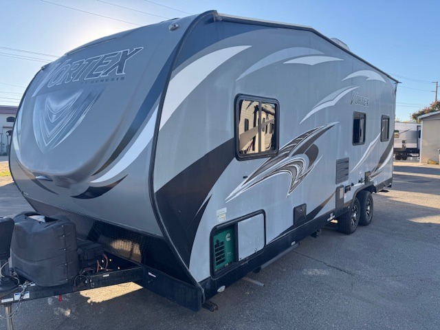 Hitch up this Vortex 2213V toy hauler travel trailer for fun and excitement at your favorite campsites. Once you reach your destination, unload the toys from the 13' cargo space and choose which direction you are headed. Once you get back you can get cleaned up in the bathroom, make dinner with the appliances provided, and talk about the day. When you are ready for bed, you have the choice of the front full bed or the rear power queen bed. In the morning you can plan for more adventure!