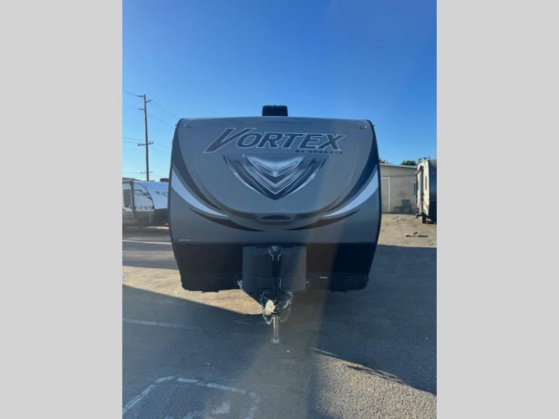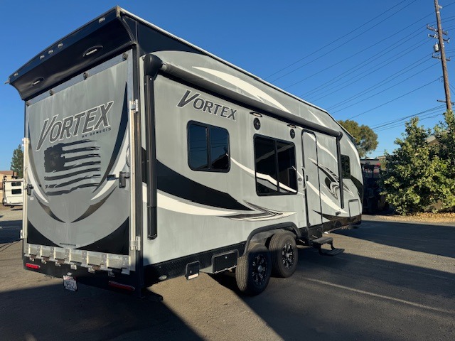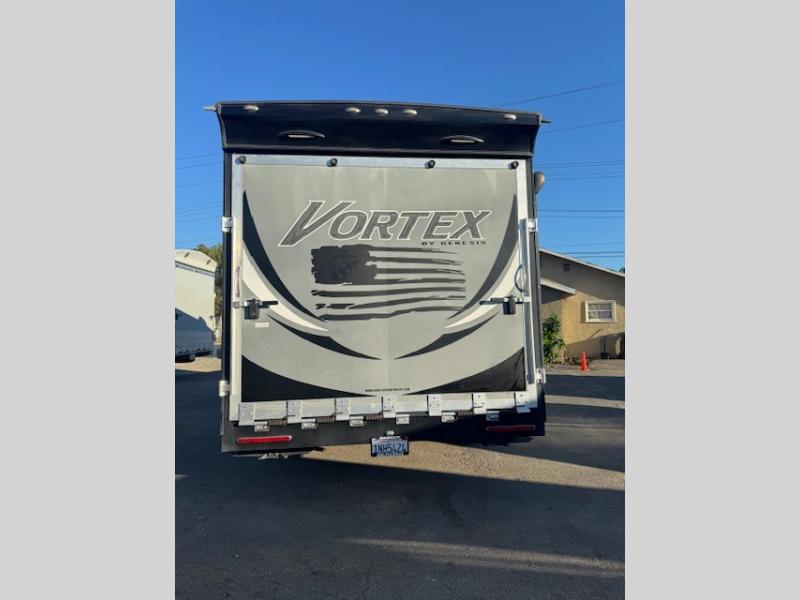 The Vortex by Genesis Supreme allows outdoor enthusiasts to enjoy luxury along with their toys in a toy hauler travel trailer. You will appreciate the wide body for more interior space, more tie downs for your toys to be secure during travel, and the awning for protection from the elements. Inside you will find comfort from the living room air conditioner, and a pillow top mattress, plus more! It's time to find adventure for your thrill seeker side that also enjoys the finer things in your favorite Vortex toy hauler today!